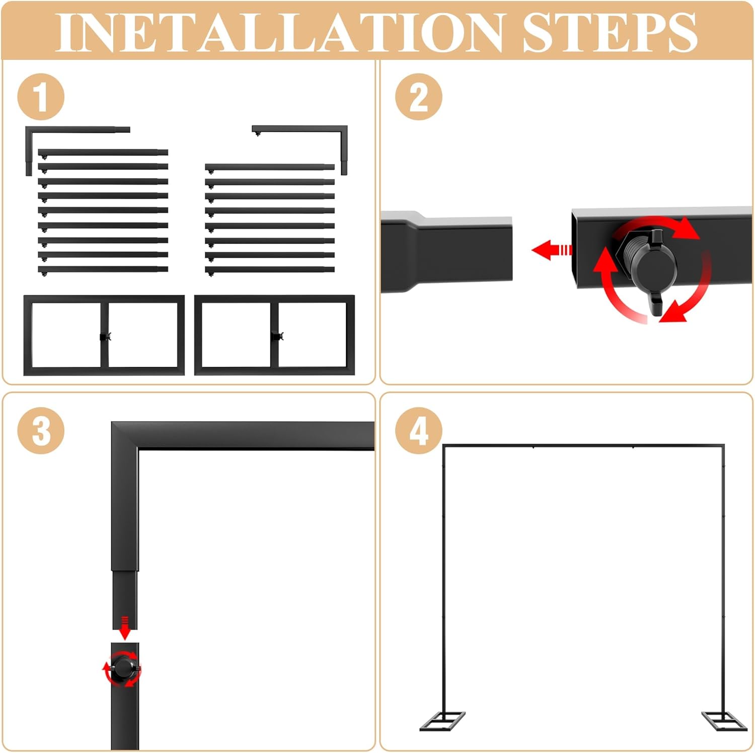 - 【Package Contains】 Black metal heavy duty backdrop stand contains L-shaped tube, L-shaped tube with one screw, Short straight tube and Rectangular base. Drape not included. These shiny white square arch backdrop stand with unmatchable class and elegance will add more color and atmosphere of festivity to your party.