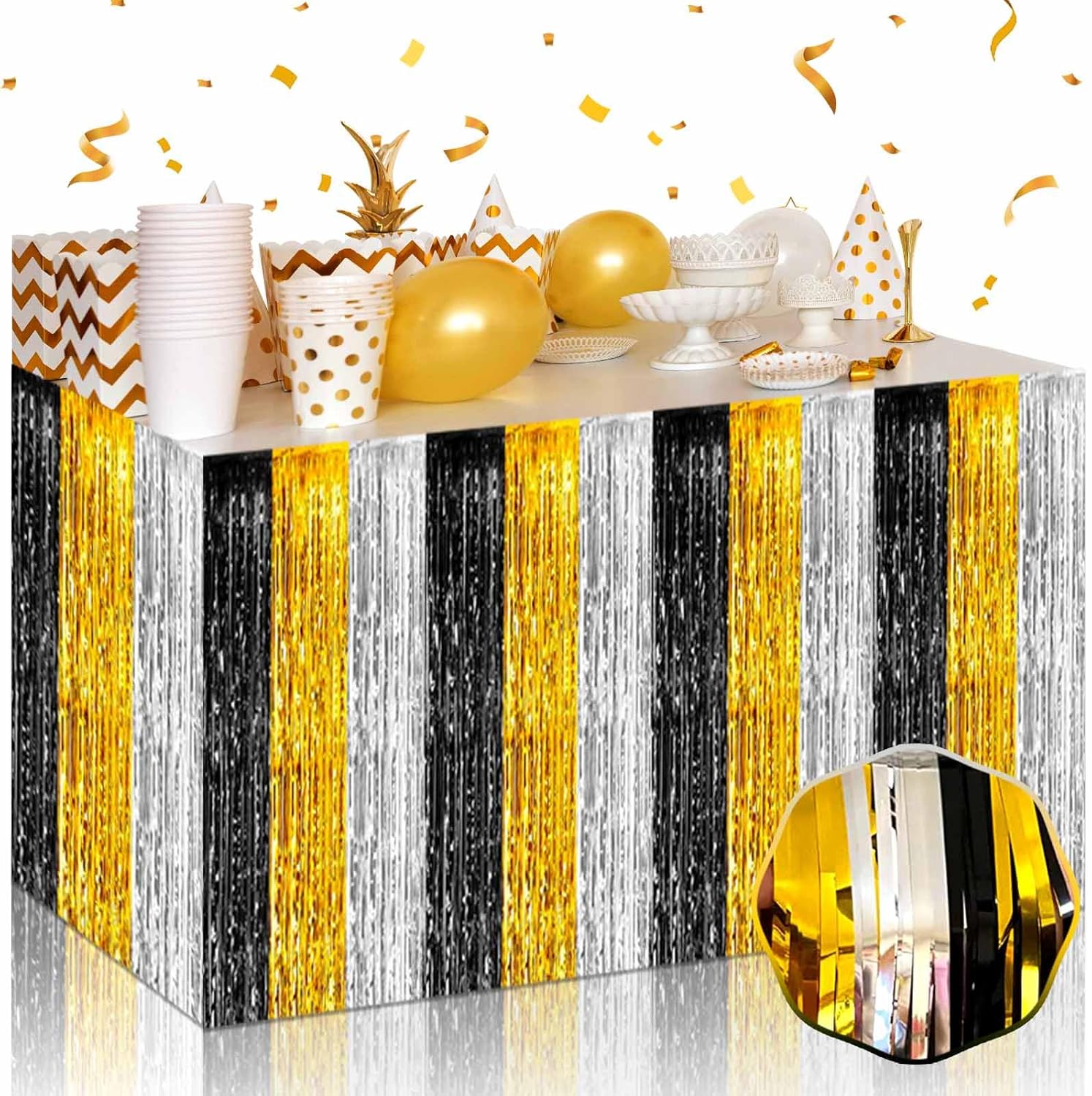 3 Pack 29 x108 Inch Black Gold Silver Foil Fringe Table Skirts Metallic Banner for Tinsel Streamer Garland Backdrop for Parade Floats Wedding Thanksgiving Birthday Christmas New Year Party Decoration