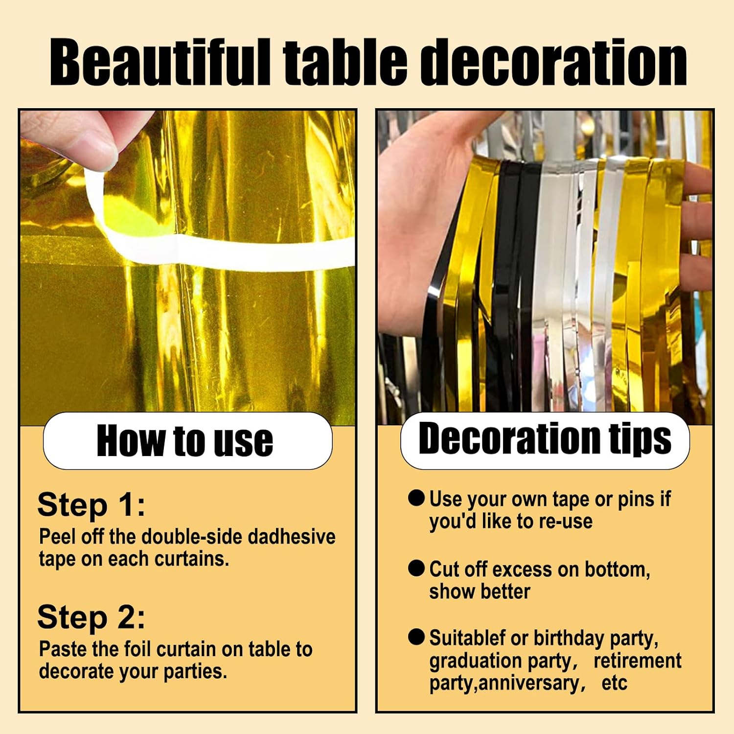 - Easy to Use: the foil fringe table skirts are made of metallic foil, lightweight and easy to use; Each metallic fringe table skirts comes with self-adhesive tape on the top for easy attachment to your wall or table, great for your party venue decoration.