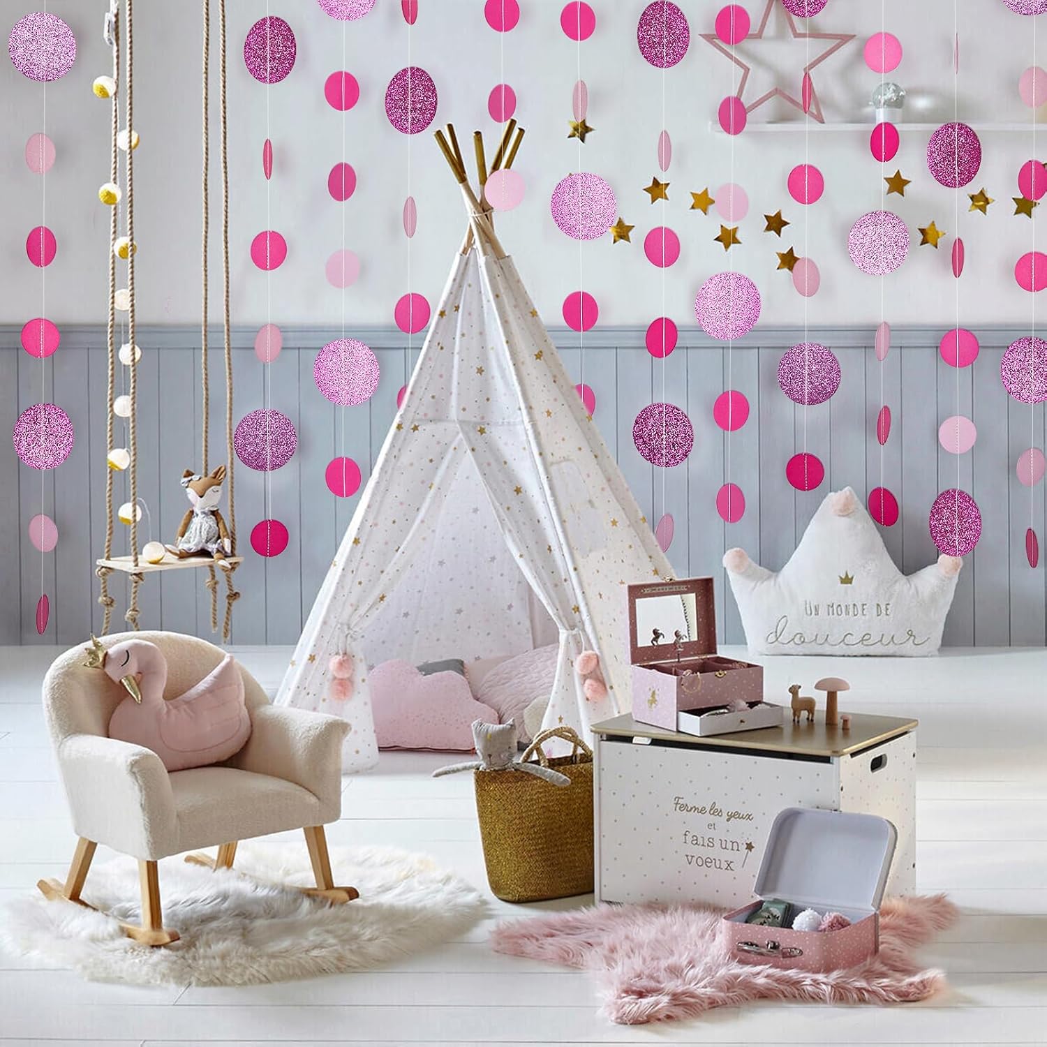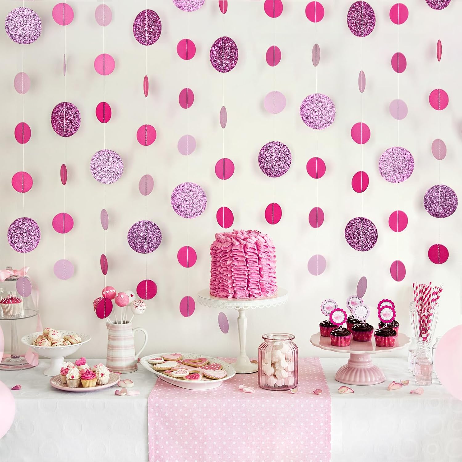 - 【Charming & Romantic Pink Decor】 Create a soft, romantic, and playful atmosphere with our Pink Glitter Dot Garland. Perfect for bridal showers, baby showers, Valentine’s Day, birthdays, and girly-themed celebrations, this garland adds a dreamy and elegant touch.