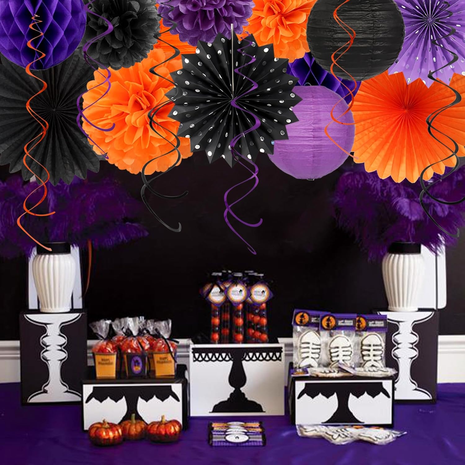 - 【Black Purple Orange Party Kits】This kits include 1pcs happy halloween banner, 1pcs circle dots paper banner, 4pcs tissue pom poms: 3pcs 10" and 1pcs 12" , 3pcs 8inch paper honeycom ball, 2pcs 8inch paper lantern, 4pcs 12inch paper flower fan, 6pcs Paper swirls hanging streamers.