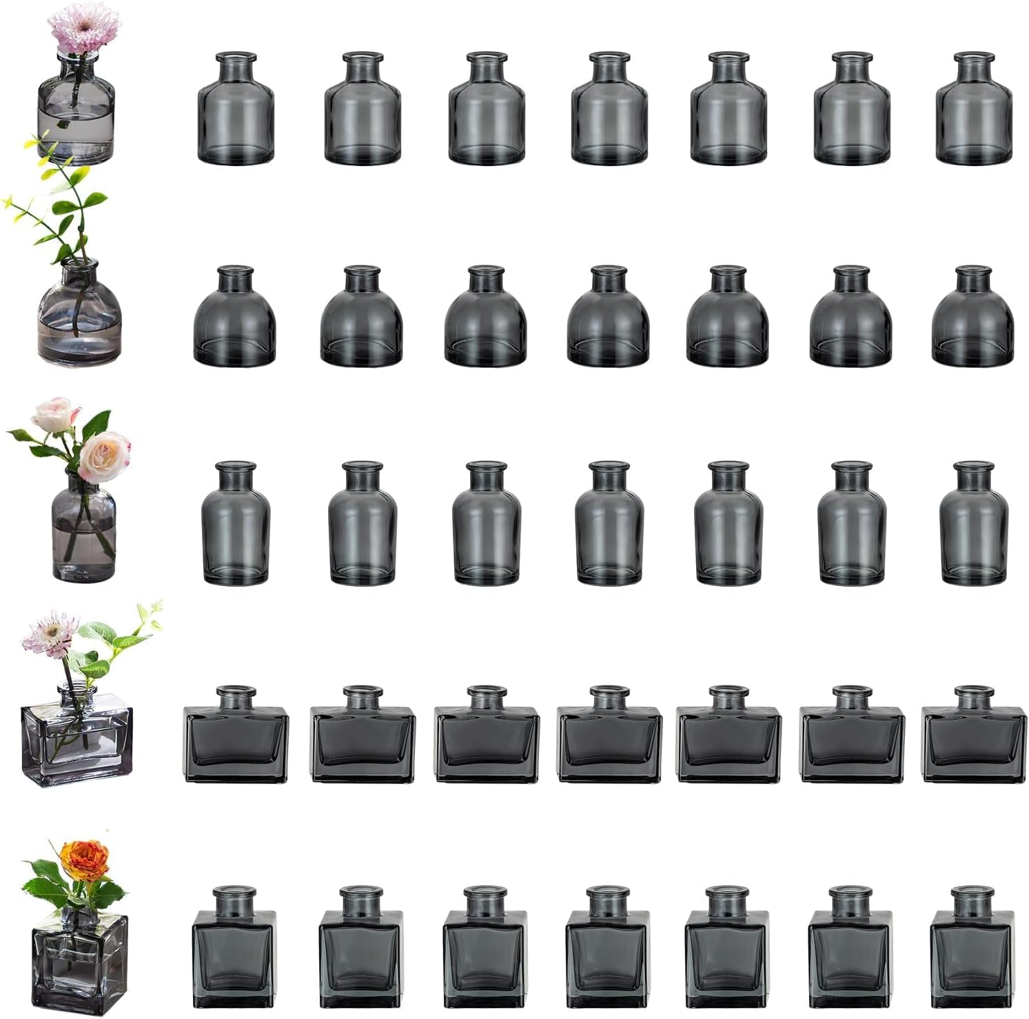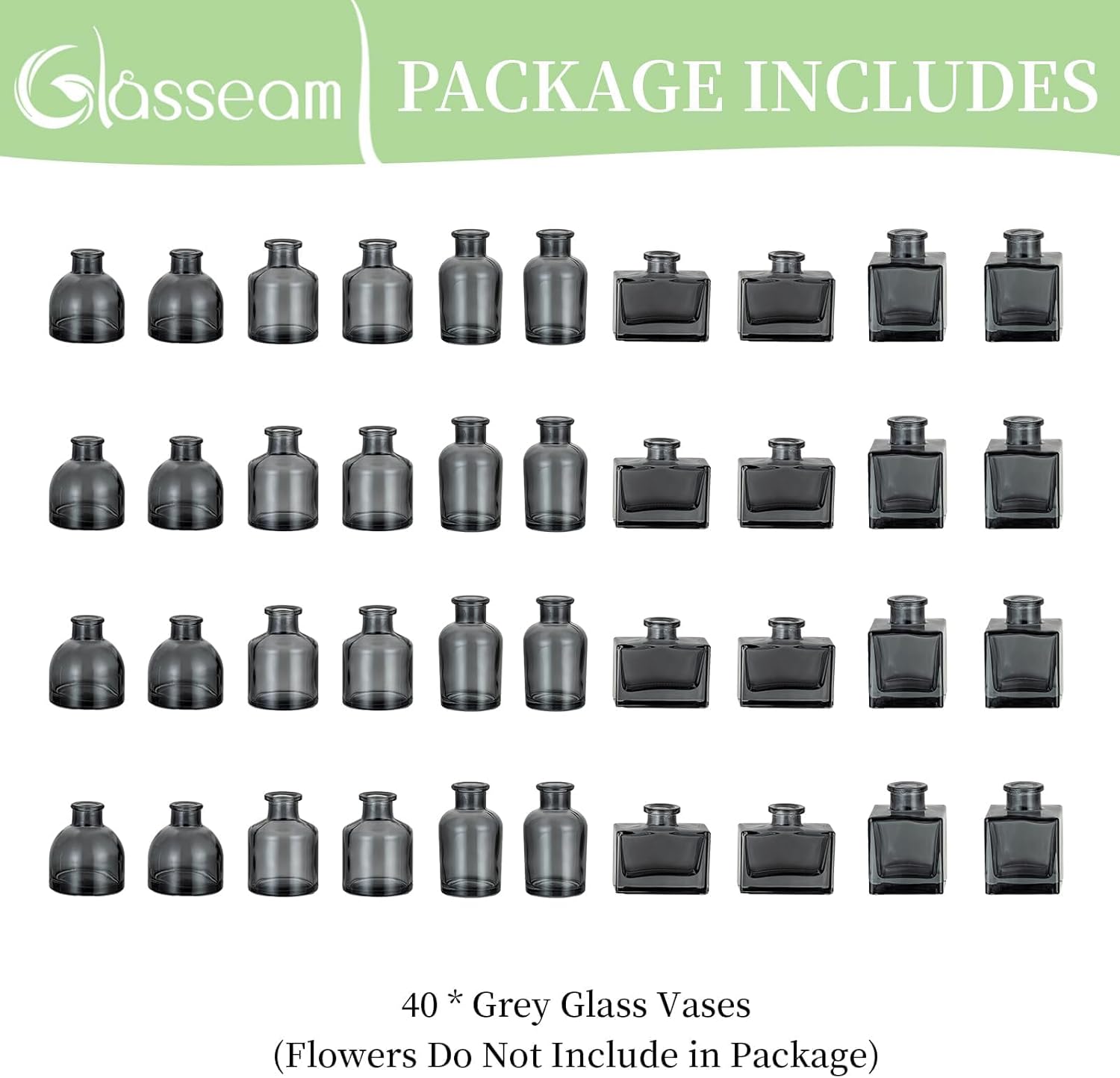 Glasseam Bud Flower Vases in Bulk: 40 Glass Cute Small Vases for Centerpieces Vintage Mini Wedding Birthday Party Table Centerpieces Tiny Baby Shower Dining Room Decoration Black Grey
