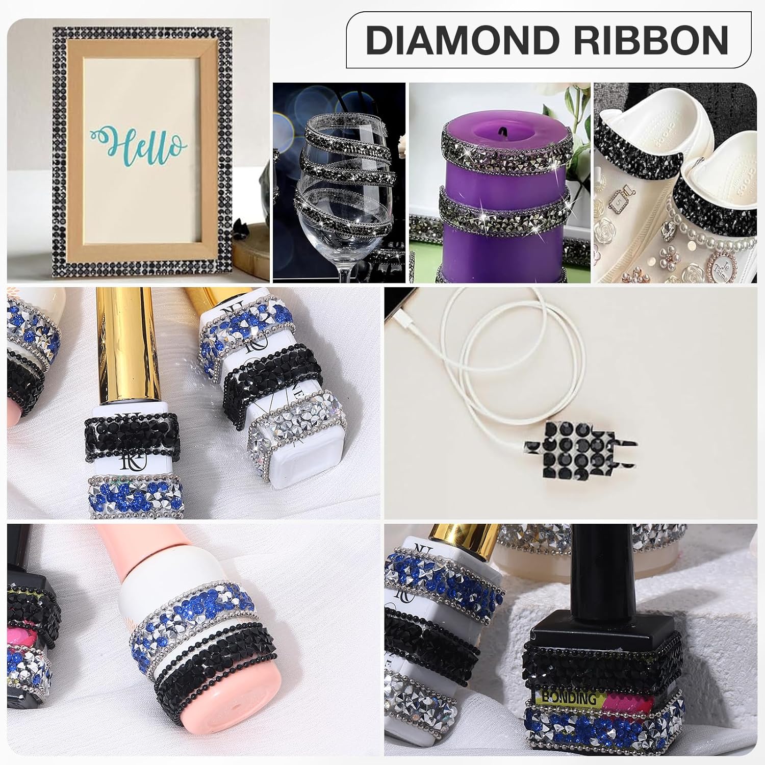 - Self-Adhesive Diamond Ribbon: The self-adhesive design with backing glue makes it possible to stick anywhere as long as the surface is smooth and clean. You cut the rhinestone ribbon into different lengths with scissors, then peel off the back paper of the sticker and paste it on the project you want to decorate.
