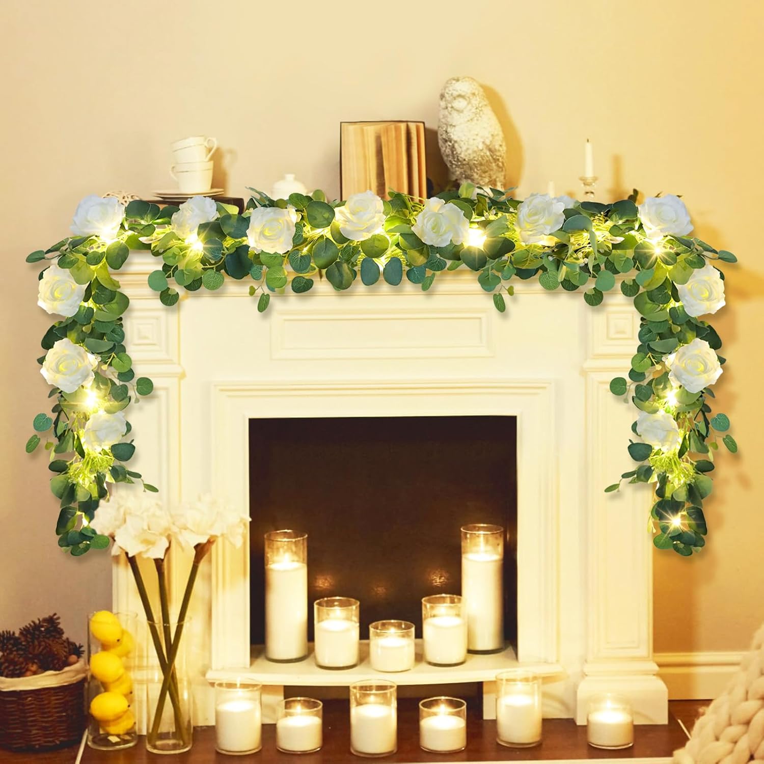 - Eucalyptus Garland with Built-in LED Lights: Transform any space into a magical setting with our 6.6FT eucalyptus garland, now upgraded with built-in led lights! Whether decorating a wedding arch, table centerpiece, fireplace mantel, backdrop, or outdoor garden fence, this rose flower garland brings timeless elegance and a touch of romance to any occasion. The versatile design allows for endless creative possibilities, making it perfect for weddings, Valentines Day, Mothers Day or seasonal celebrations
