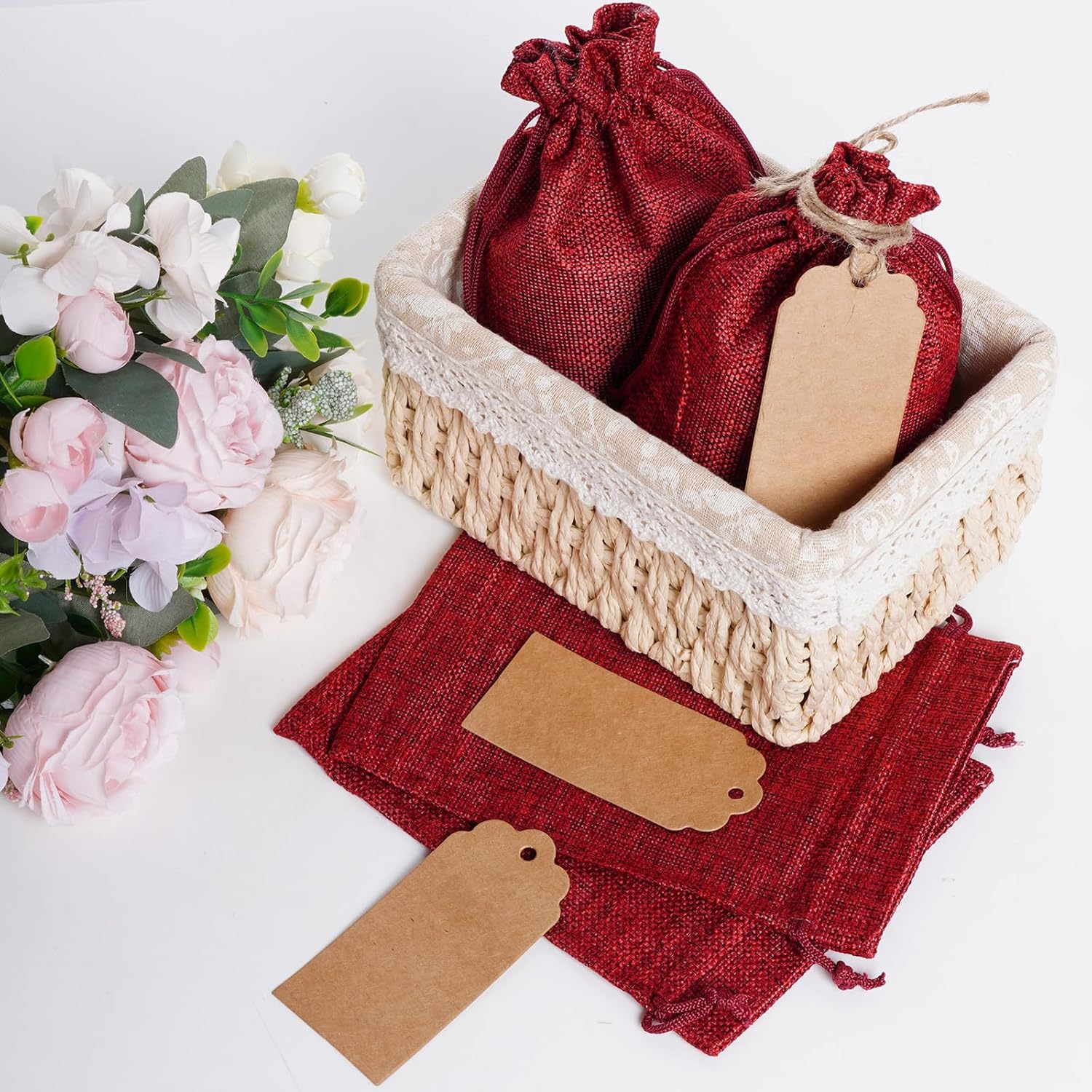 - Quality Material: Large burlap bags are breathable and durable, maintain air circulation and reused. The gift rope is also made of high quality nylon rope, through the gift label, pull the rope tight, you put in spices or small jewelry, it will be a great present bag, and red bag is perfect for Christmas