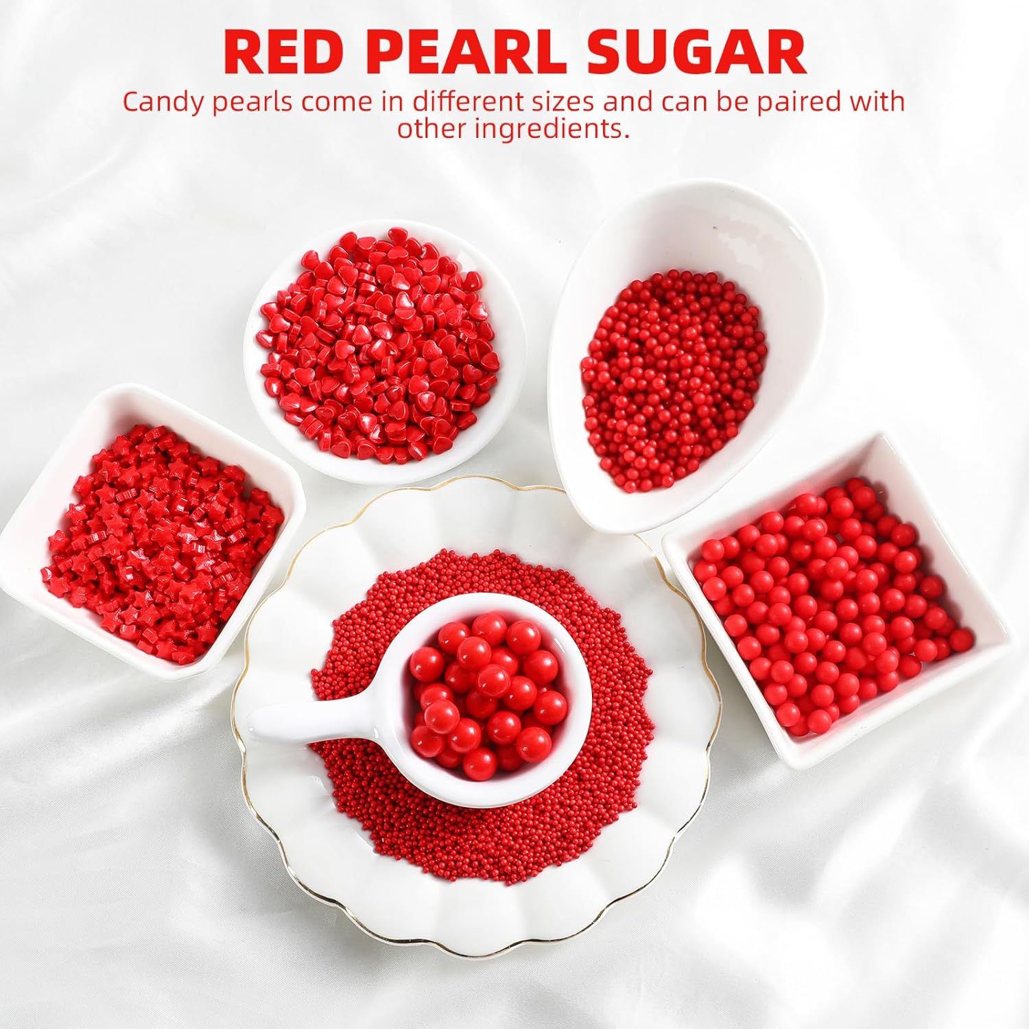 - ✨PACKAGE INCLUDES: 1 edible bottle of Red pearl sugar, 130g/4.58 oz. The main ingredients of sugar pearls are: sugar, beetroot, spirulina, carnauba wax, gluten free, nut free.