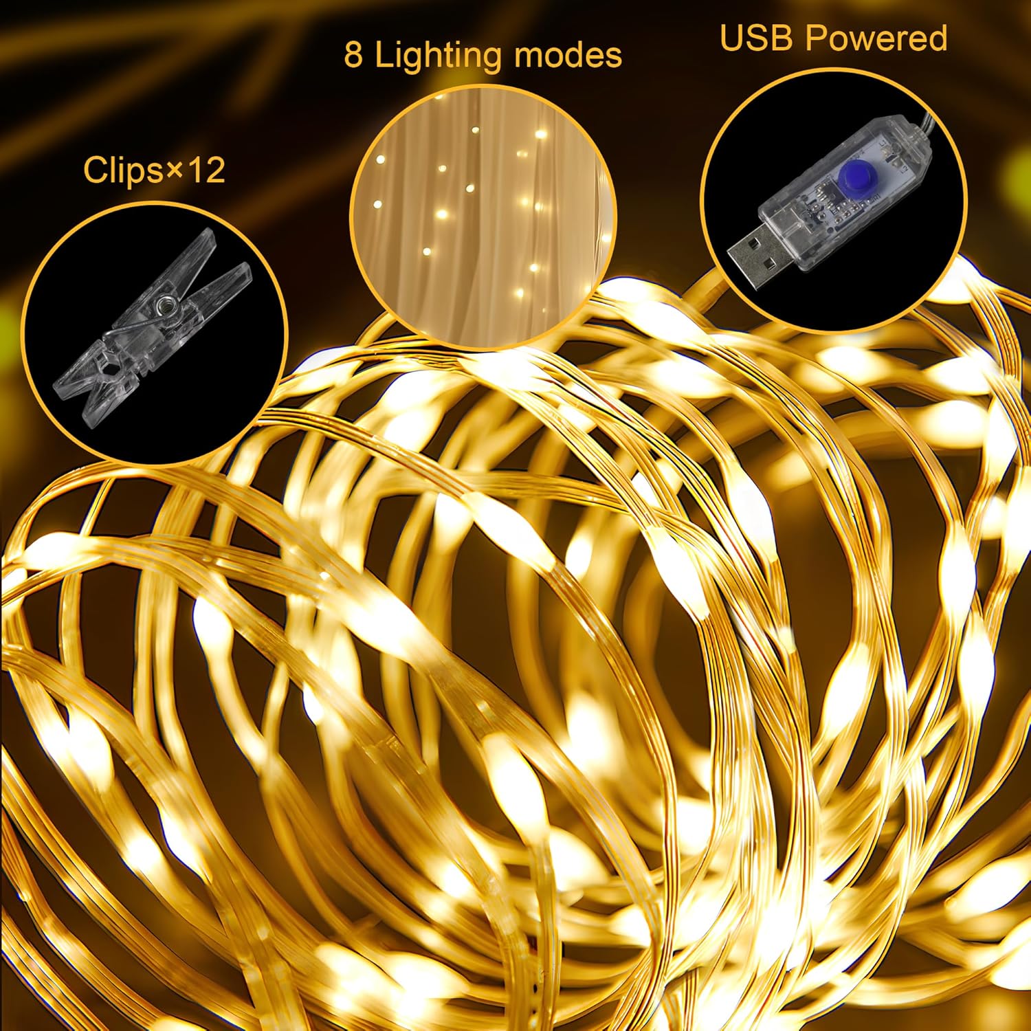 - Package Includes: The package includes 2 panels champagne sheer tulle backdrop curtains, each curtain backdrop is 5FT width and 10FT height. Also it includes a set of 10FT (10 strands) warm string light (USB Powered) and 12pcs transparent clips.