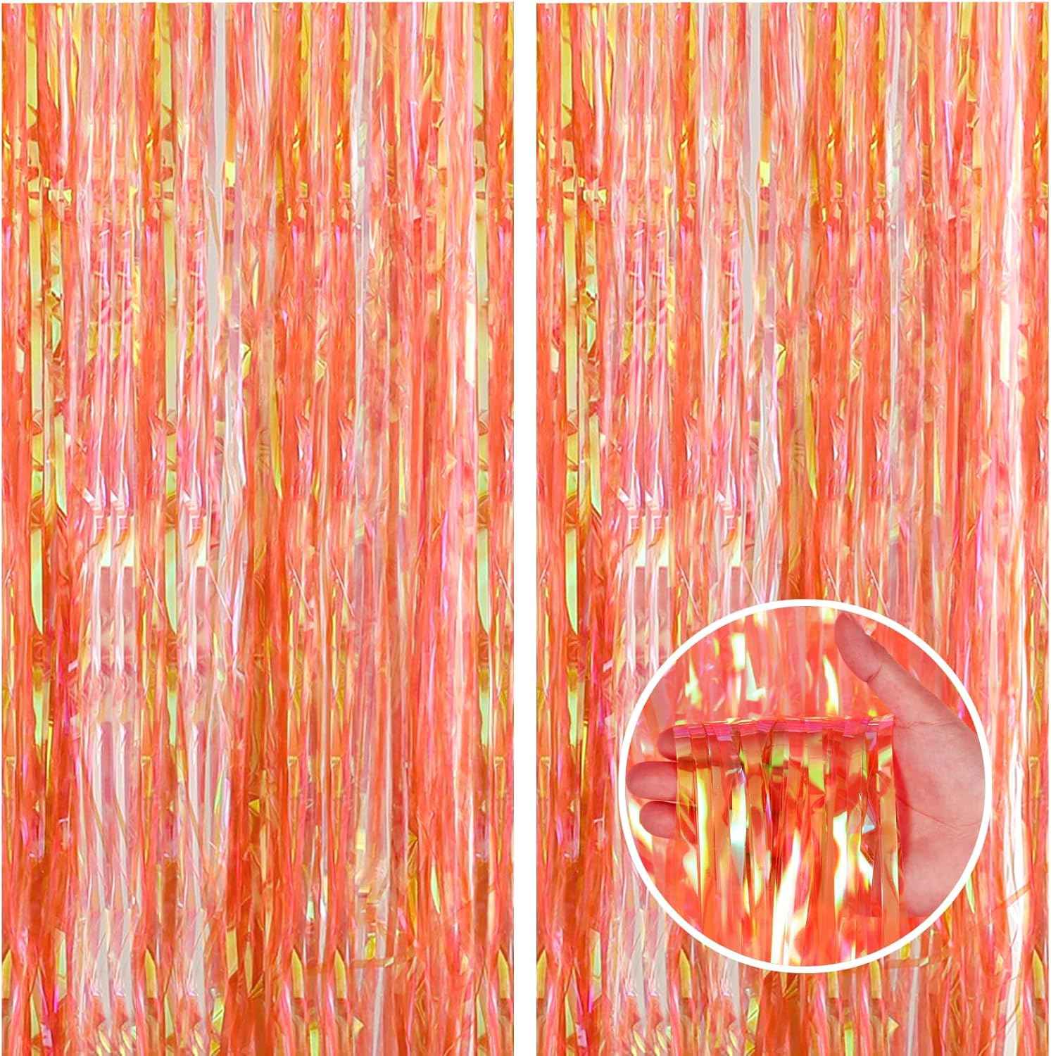 CANREVEL 2 Pack 3.2x6.5 Feet Iridescent Foil Fringe Backdrop Curtains, Clear Orange Tinsel Photo Booth Props Streamers Party Decorations for Birthdays Fall, Thanksgiving, Basketball Party