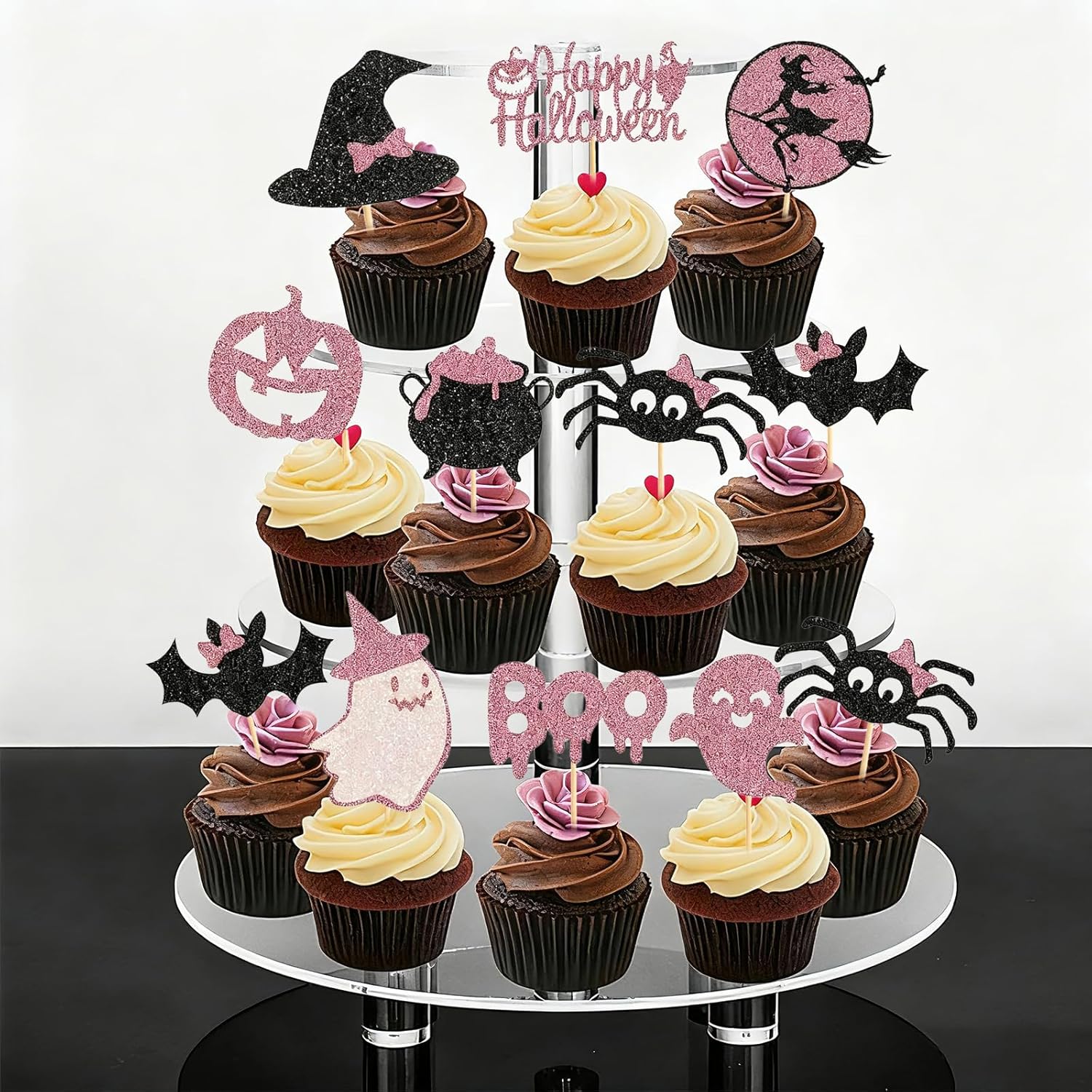 60Pcs Halloween Cupcake Toppers, Bat Pumpkin Ghost Cupcake Decorations for Halloween Party Supplies,Pink Multi Style1