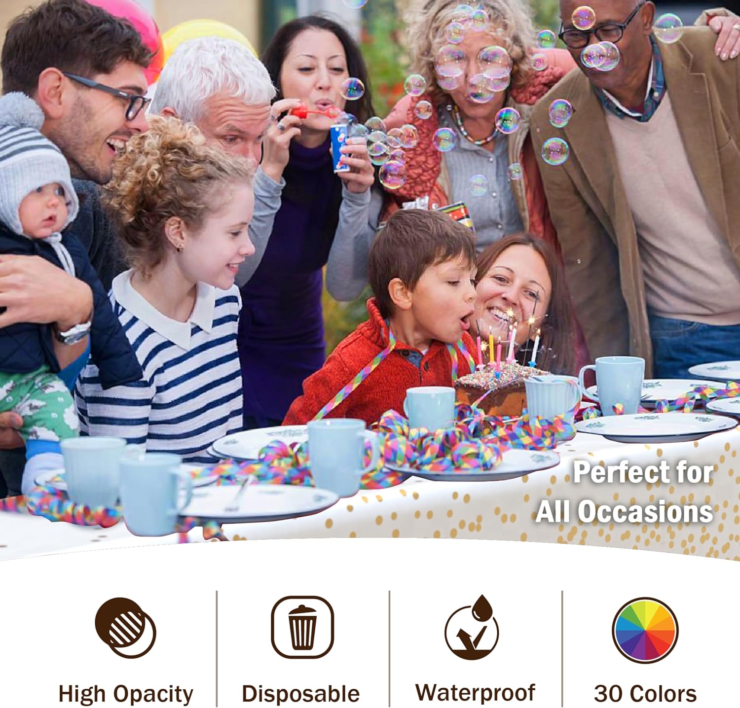 - HIGH OPACITY: covers any table with minimal transparency. Great plastic tablecoth for parties, weddings, holdiay party, , birthday parties, christmas, thanksgiving dinner, bbq, and any other color themed event.