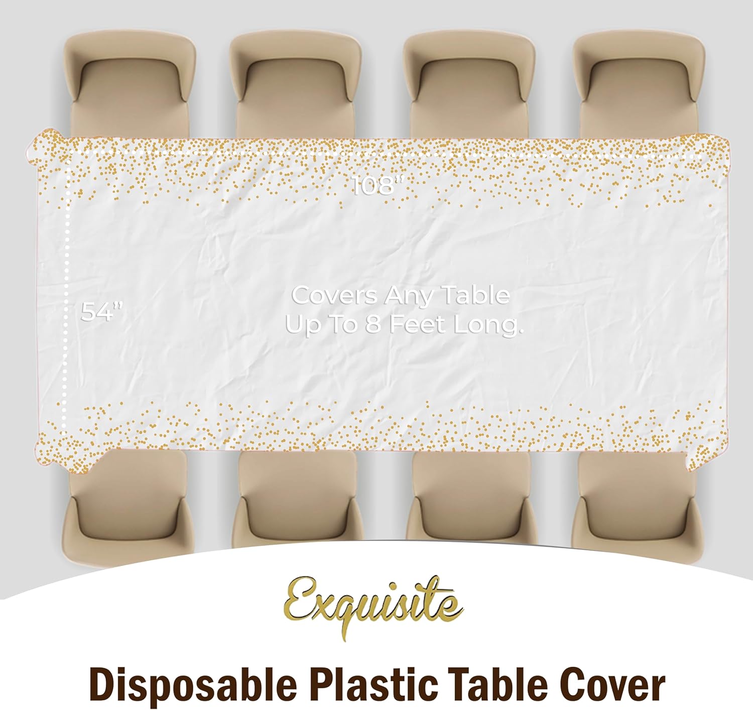 - PREMIUM QUALITY PROTECTION: This 12 pack of 54 in. x 108 in. Rectangle White with Gold Dots plastic tablecloths will cover any table up to 8 feet. Unlike your typical paper table clothes these disposable table covers for parties are spill and waterproof!!!