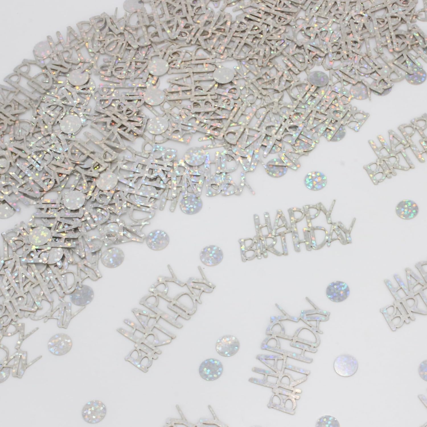 - Material: Happy birthday confetti for table is made of glitter iridescent card. The iridescent confetti is indelible, reusable, and sparkling in the sunlight, and it’s a very attractive presence wherever it goes