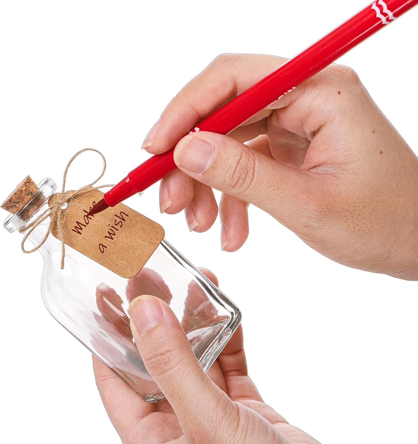 - Specifications: This pack includes 20 pcs 3.4oz glass jars, 50 brown paper labels and a big bundle of string. Each jar measuring 2" W x 4.1" H. Opening diameter: 0.6 inches. You can add your own personalized touch to every bottle!