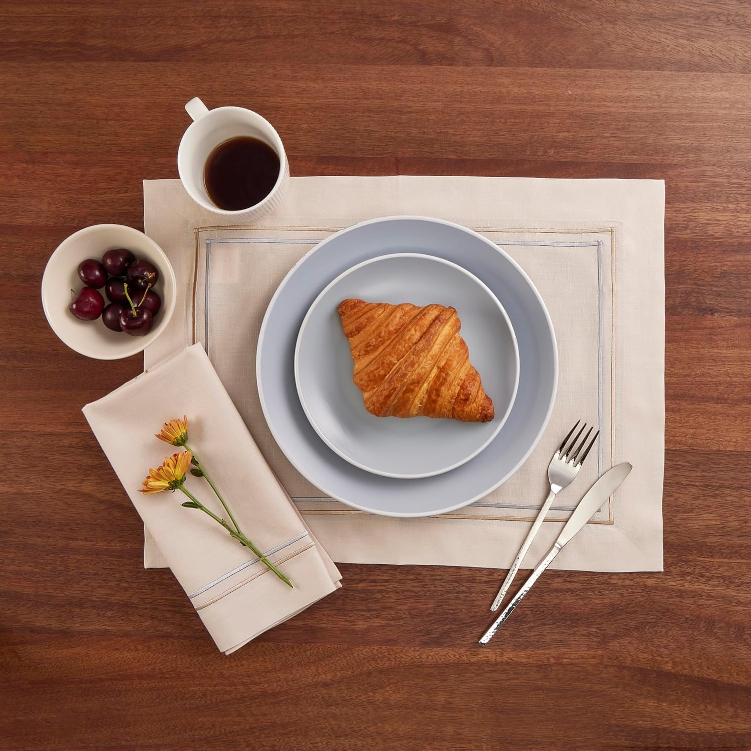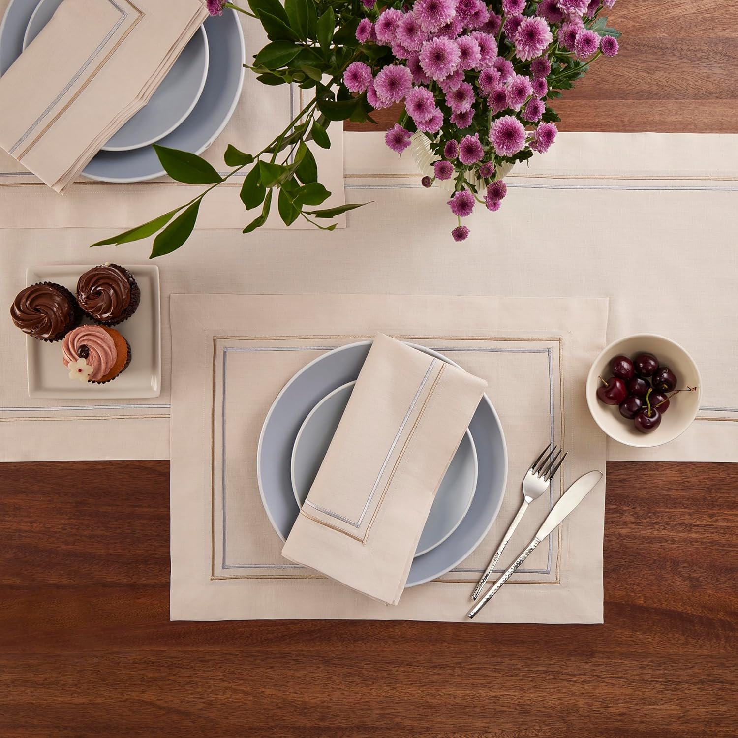 - Imara Elegance: These dinner napkins feature refined silver and dull gold line border embroidery on a linen-colored Cotton-Linen base, adding a touch of understated luxury to your table