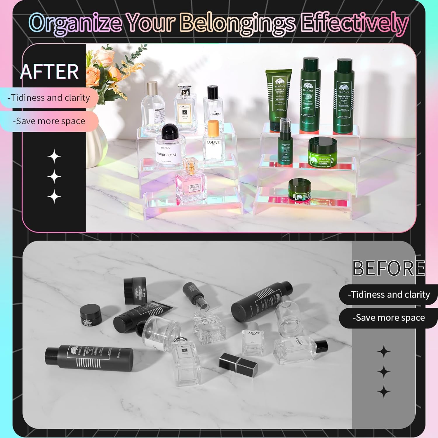 - VERSATILE USES: The iridescent display risers can meet your different needs for displaying and organizing various items such as desserts, jewelry, shoes, cosmetics, perfume,potted plants,collectibles, and more and suitable for living room, bedroom dresser, kitchen, display cabinet. Besides home use, our acrylic display stand can be used in other places, especially for birthday parties, weddings, art exhibitions, buffets and stores.