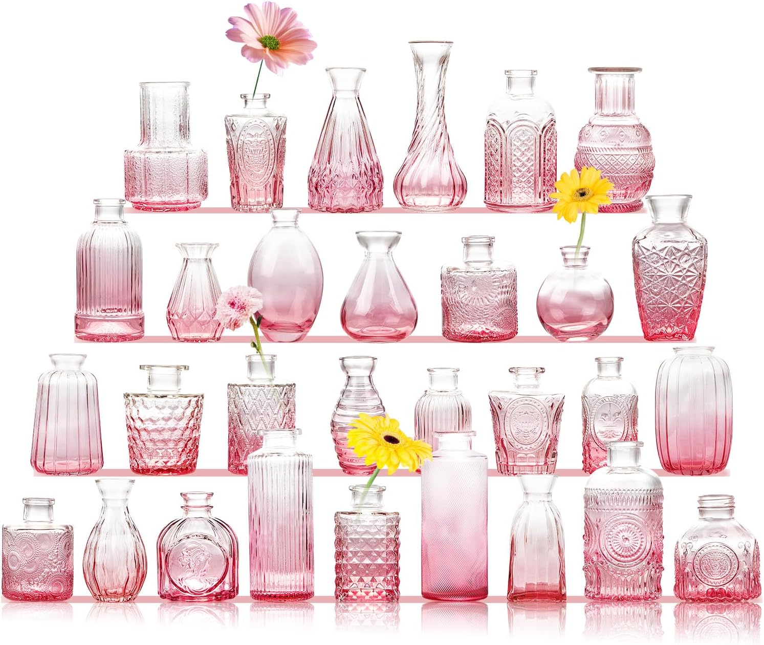 - 【 Bud Vases Set 】 This bud vases in bulk come with 30 small pieces in gradual pink, can be used to hold fresh flowers, dried flowers, branches, greenery or other mini decorations to keep them alive and beautiful with filled water at the bottom