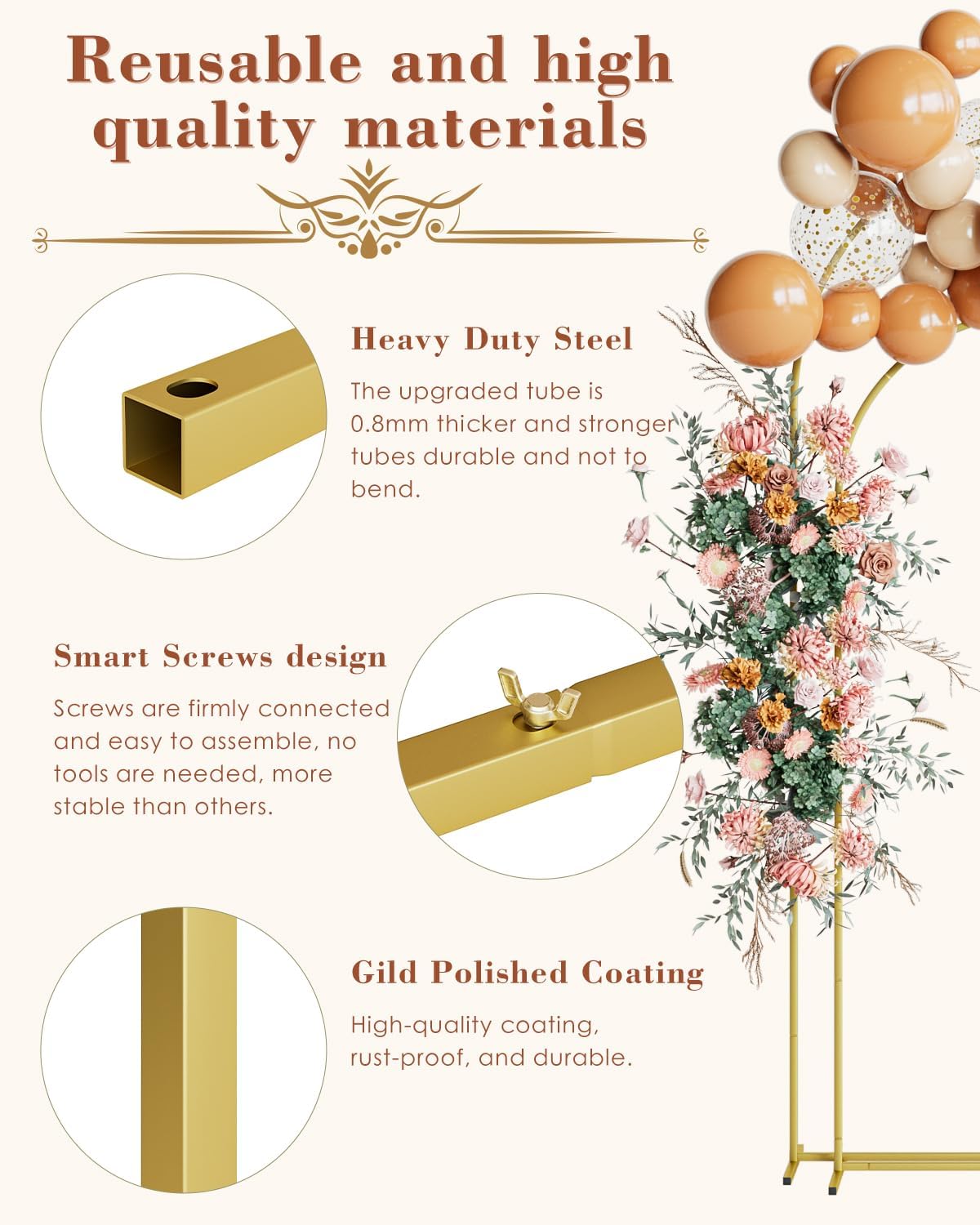 - Easy to Assemble: Our metal wedding arch stands, including a wedding arch frame suitable for balloon arch backdrops, are made of sturdy and lightweight square steel pipes with a bright gold color. With a higher bearing capacity and easy assembly, the arch frames can be quickly put together with screws in minutes. The metal arch backdrop stands are designed for easy disassembly by a single person, making setup convenient and hassle-free for any event.