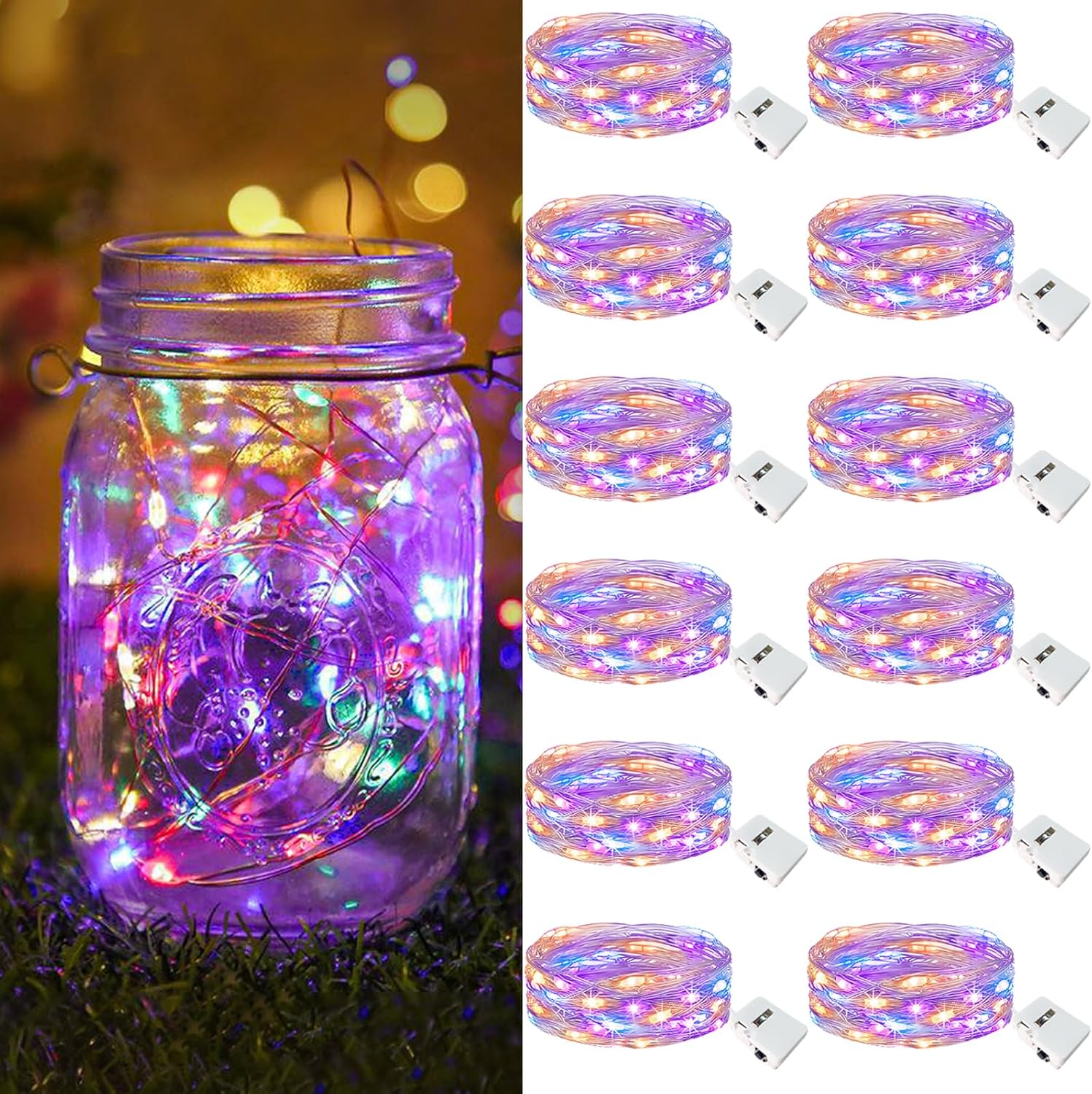 btfarm 12 Pack Fairy Lights Battery Operated [3 Modes], 7ft 20 Led Twinkle Lights String Lights Waterproof Bulk Small Mini Silver Wire for Mason Jars Vases Wedding Table Centerpiece, Colorful