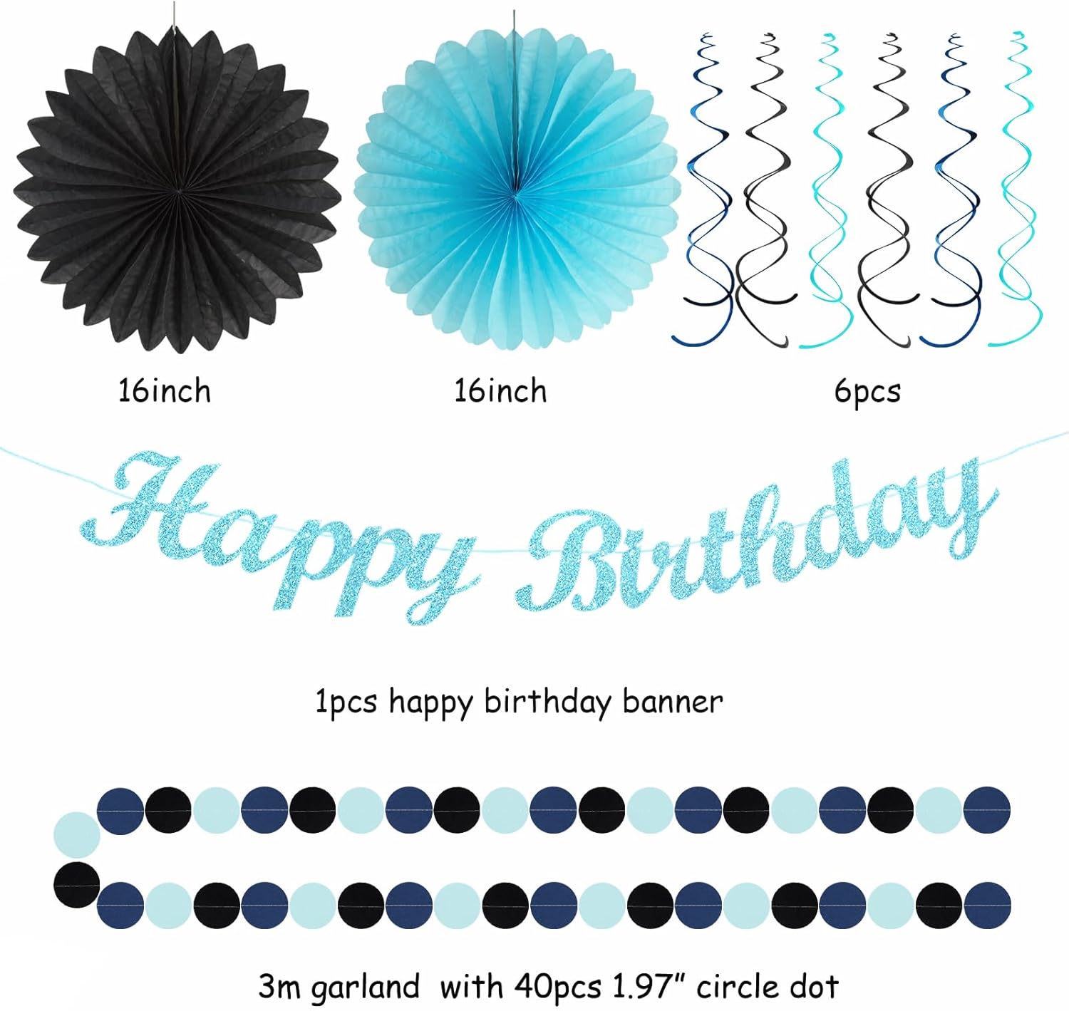 - 【Light royal navy dusty blue black Birthday kits】This kits include 1pcs happy birthday banner, 1pcs circle dots paper banner, 4pcs tissue pom poms: 3pcs 10" and 1pcs 12" , 3pcs 8inch paper honeycom ball, 2pcs 8inch paper lantern, 4pcs 12inch paper flower fan, 6pcs Paper swirls hanging streamers.