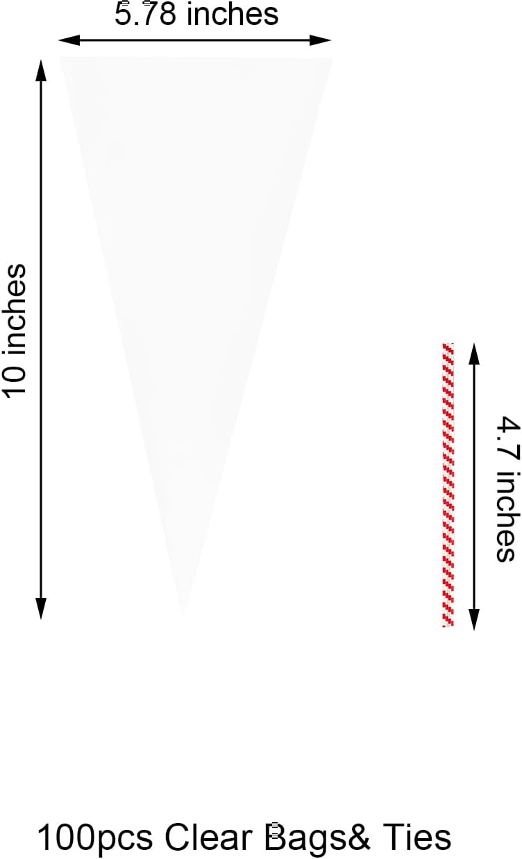 - 【Crystal Clear & Food-Grade Transparency】: Made from premium, extra-thick, food-grade OPP material, our cone bags offer a crystal-clear appearance that beautifully showcases candies, popcorn, handmade gifts, and more. The crisp material enhances the look of your packaging, making it ideal for parties, weddings, and holiday gift wrapping, ensuring your treats stand out.