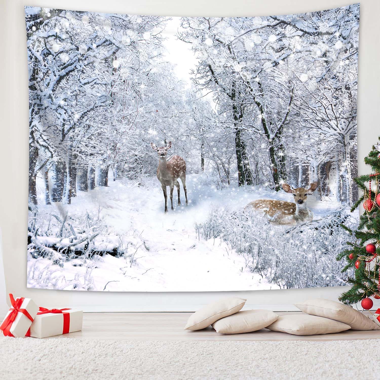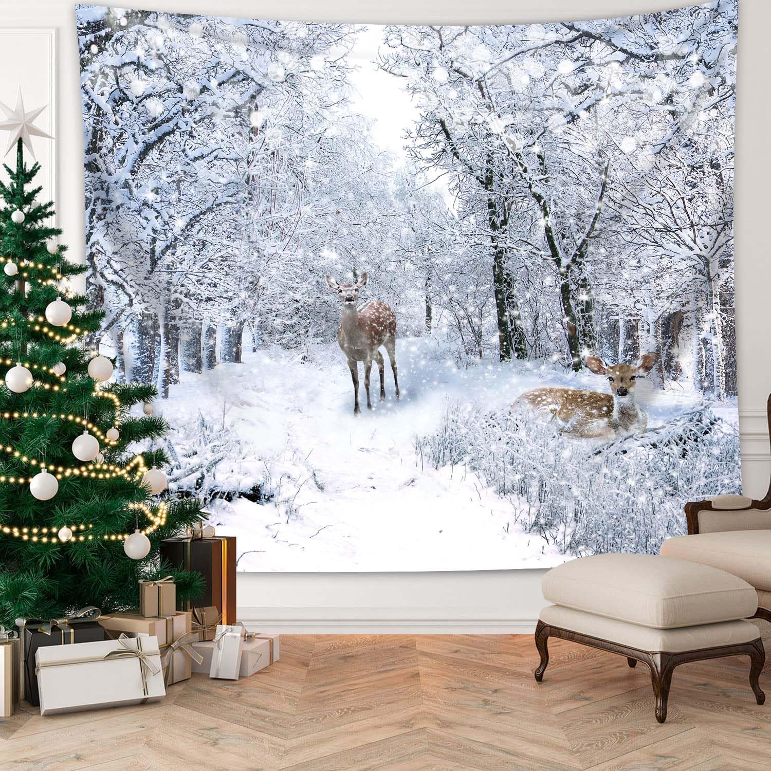 QGHOT Winter Tapestry Wall Hanging, Snow Scene Backdrop Winter Wonderland Wall Decor Snowy Forest Wall Art Nature Woodland Deer Tapestry for Bedroom Room Dorm Party Decoration, Large