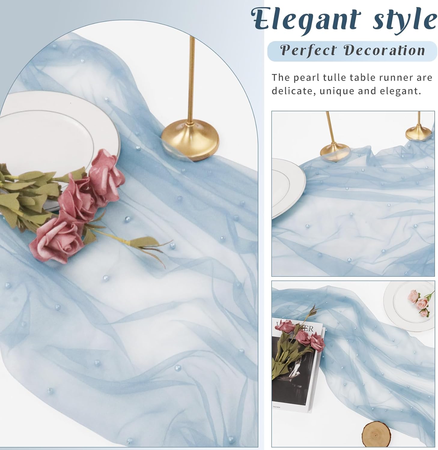 - 【Exquisite Workmanship】 These romantic table runners are made of premium tulle. Soft feeling, sheer, reusable, easy to clean and fade resistant. Delicate pearls embellished table runner works perfectly for many types of event decor, which will add a ton of elegance to any space.