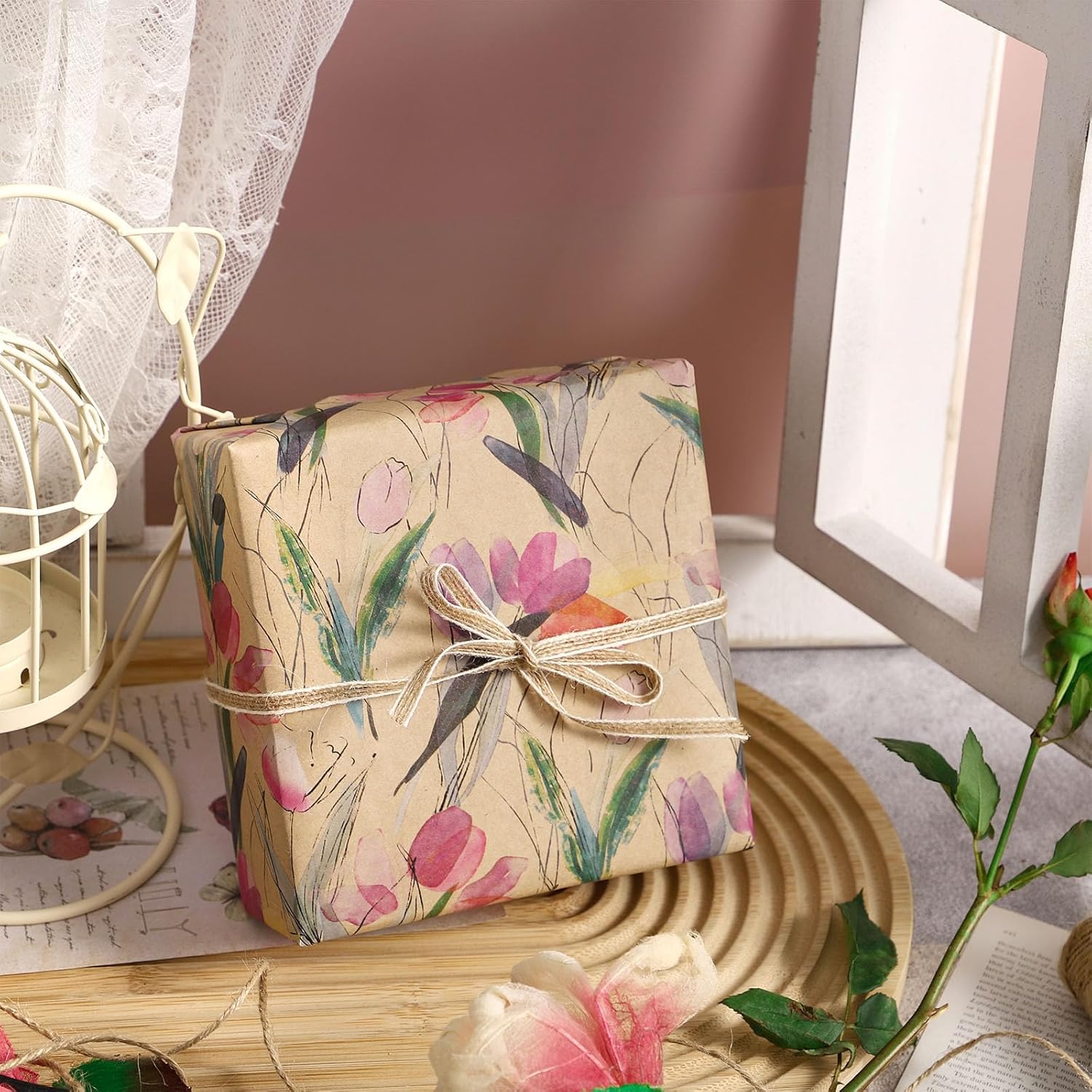 RUSPEPA Flower Wrapping Paper Roll, 17 in x 16.4 ft, Mini Roll, Tulips Watercolor Gift Wrap, Floral Kraft Wrapping Paper for Women, Girls, Spring, Summer, Wedding and Mother's Day