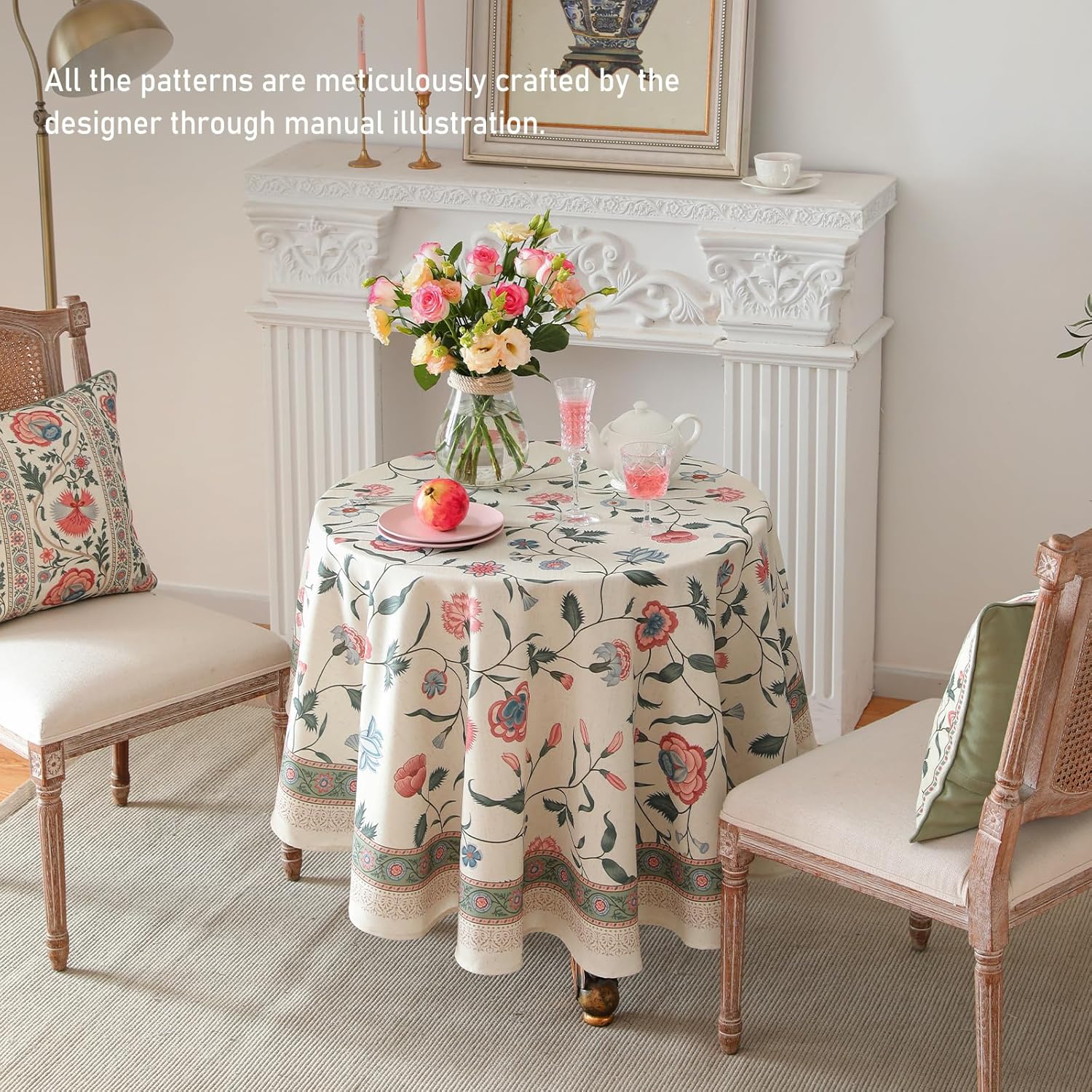 ISAENNE Designer Chinoiserie Linen Floral Round Tablecloth,White Wrinkle Resistant Table Cloth,Elegant Decor Tablecloths for Dining Thanksgiving Kitchen Party Christmas,Diameter 67"-Daffy