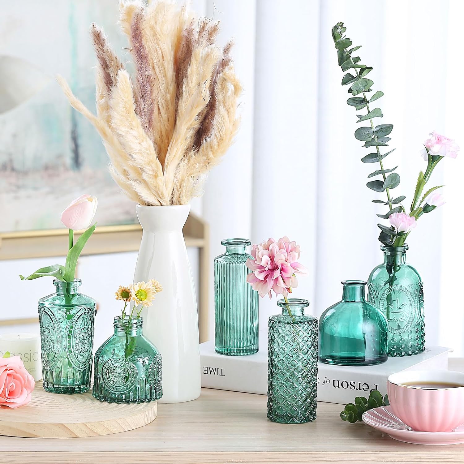 - Exquisite Craftsmanship: Crafted from premium-quality glass material, our bud vase set ensures both durability and elegance. The smooth bottle mouth offers a comfortable touch, while the thickened bottom provides enhanced stability. Adorned with unique etched patterns, these vases exude a timeless vintage charm, seamlessly blending into various room aesthetics.