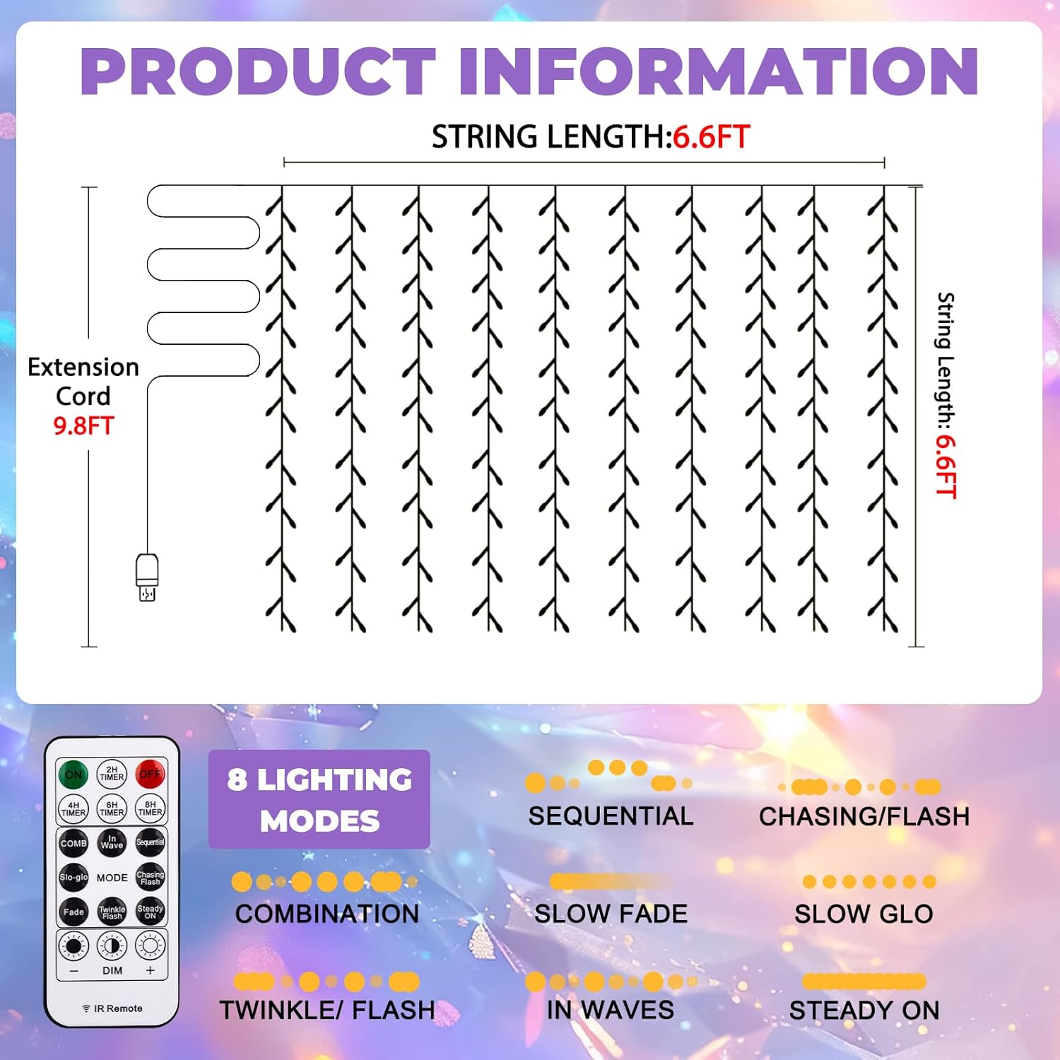 - Tangle-Free Curtain Lights: 200 super bright LED bulbs, the 6.6x6.6Ft curtain lights come with a 9.8Ft extension cord; With 10 drop light strings, each holding 20 LEDs, and convenient hooks at the top for easy hanging, they effortlessly add warmth and sparkle to any room, creating a dreamy, fairytale ambiance that fills your space with joy and serenity