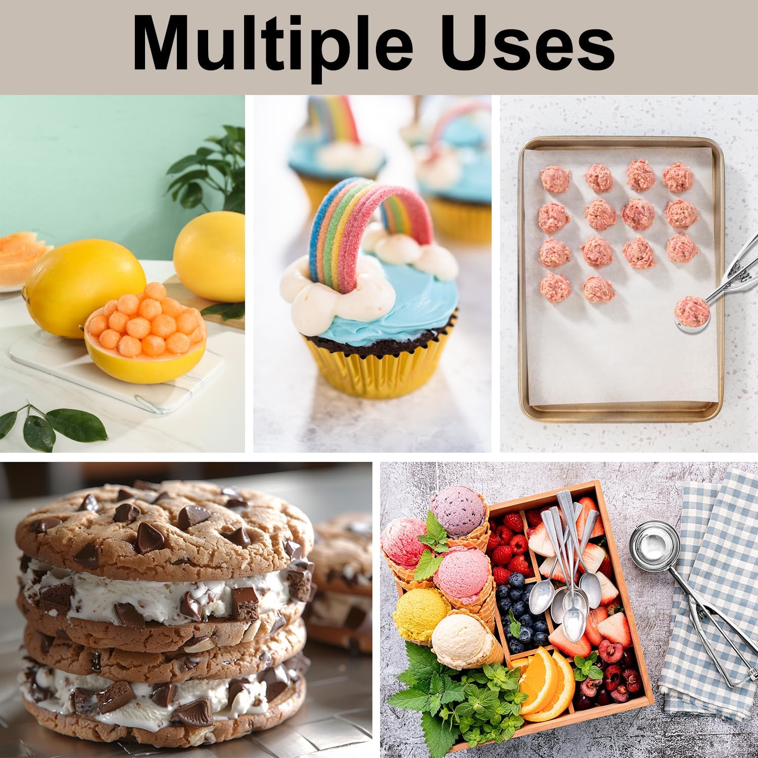 - 【Multiple Uses, Ideal Baking Scoop】 The cookie scoops for baking set of 3 can be used to make delicious cookies, muffins, cupcakes, ice cream scoop, melon ball, meatballs, chicken salad, mashed potatoesand meatball and more. Anyway, they can scoop right portions for making variety of food.