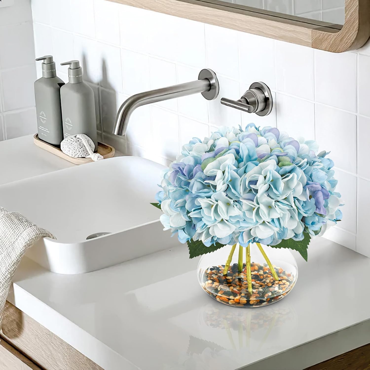 N&T NIETING Artificial Hydrangea Flowers with Vase Blue Silk Fake Flowers Faux Hydrangea Flowers with Faux Water Riverstones for Home Office Table Room Wedding Centerpiece Decorations