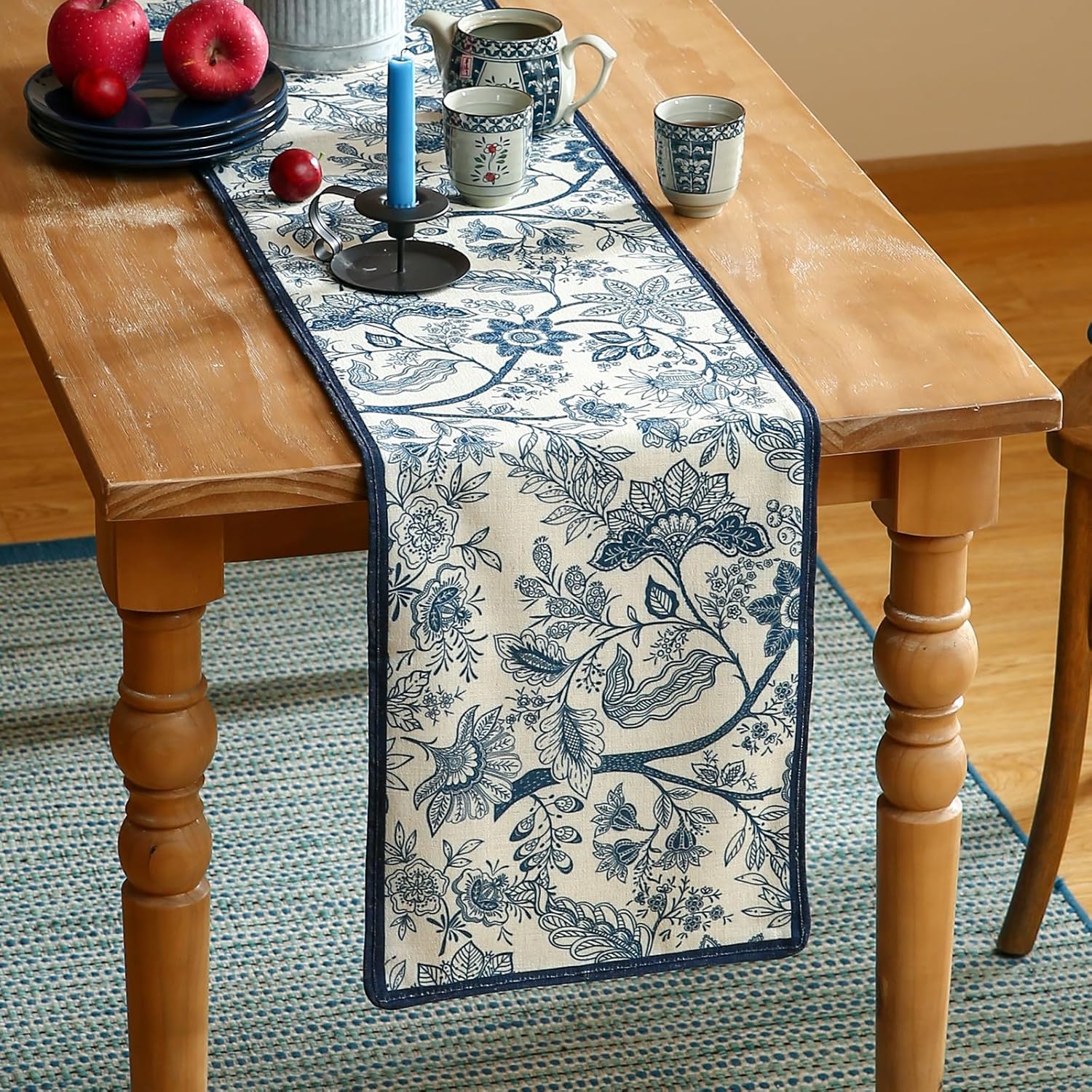 ISAENNE Designer Chinoiserie Elegant Linen Table Runner 71 Inches Long,Blue Floral Pattern Decor Table Runners for Thanksgiving,Dining Room,Banquet,Kitchen Tables,Christmas,12"*71"-Ruyi B