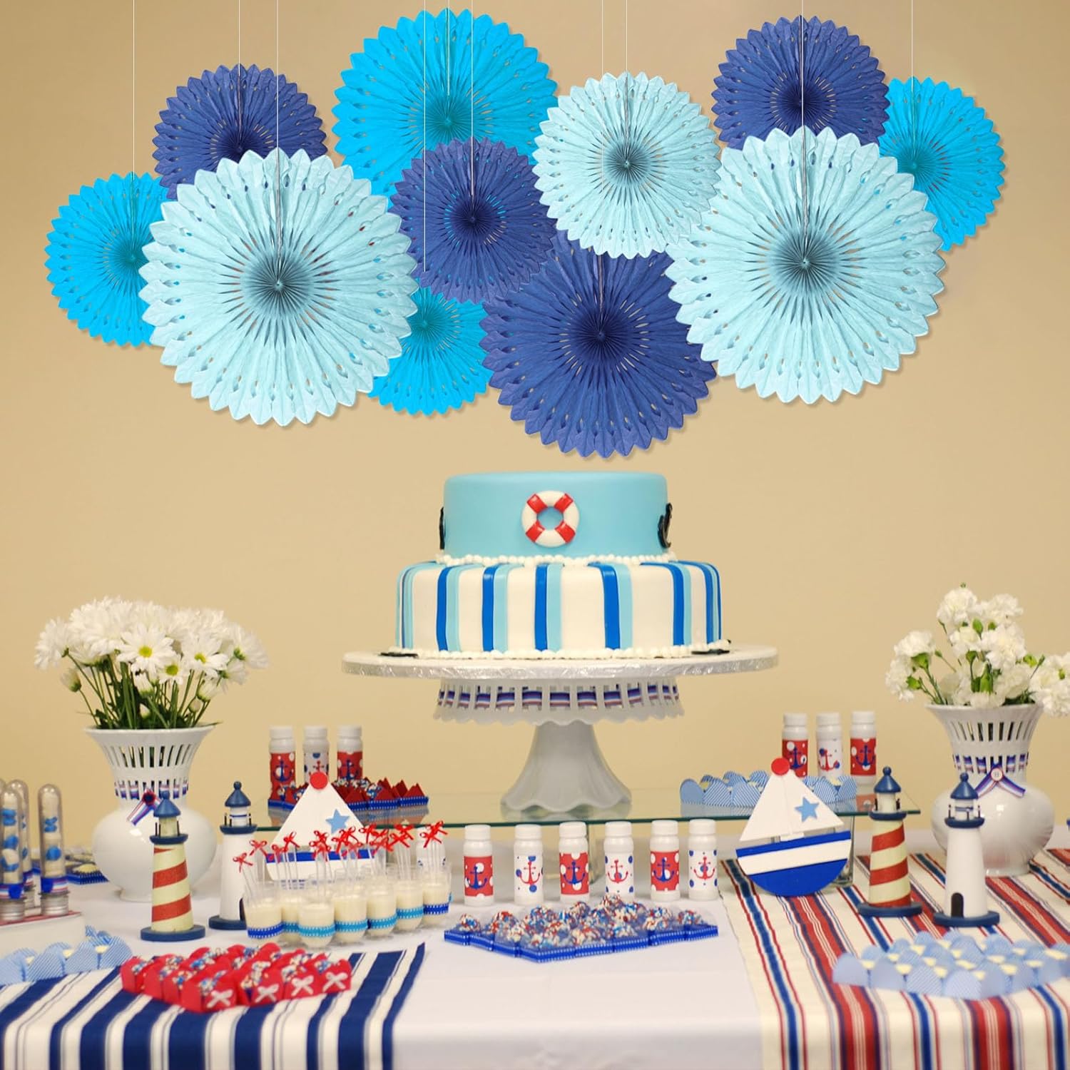 18 Pcs Blue Set Hanging Paper Fan, Hanging Honeycomb Round Paper Fans for Weddings, Birthdays, Baby Showers, Classroom, Events Ceiling Party Supplies Decorations