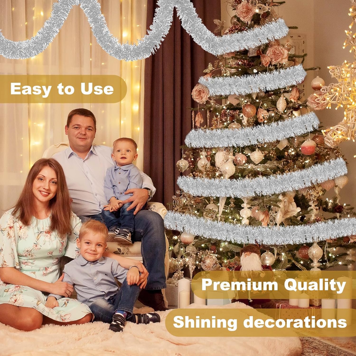 - Easy to Use: You can just hang the tinsel garland ornament on the christmas trees, not need many tools, and if you want to decorate them on the walls or stairs, you can use glue to stick them up, also use scissors to cut to the right length, twist them into various shapes as you like, then hang on to make your home full of joyful feelings