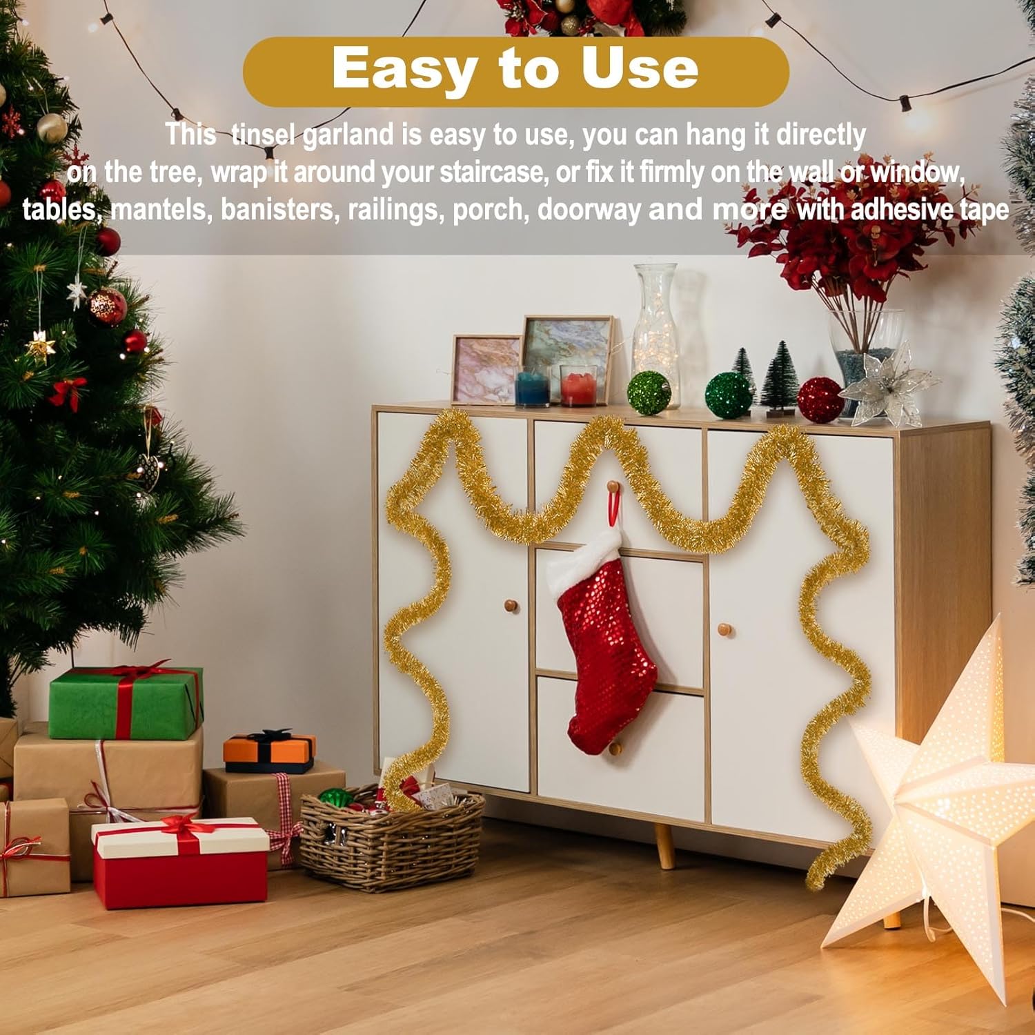 - Easy to Decor: Christmas tinsel garland include a soft, bendable wire inside, making them resistant to breakage and allowing you to shape them as you desire for your DIY Christmas tree decorations, can use glue to stick them up, also use scissors to cut to the right length, twist them into various shapes as you like, then hang it anywhere you want