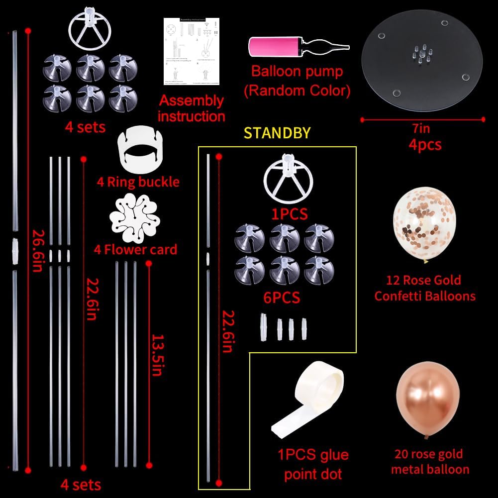 - Package Includes: The balloon stand kit includes 4 reusable balloon centerpiece table decorations and 12 inch 32 pcs rose and gold balloons(16 rose gold+16 rose gold confetti balloons),glue point dots,balloon pump,balloon clips,and tie tool.You don’t need to waste money to buy balloons