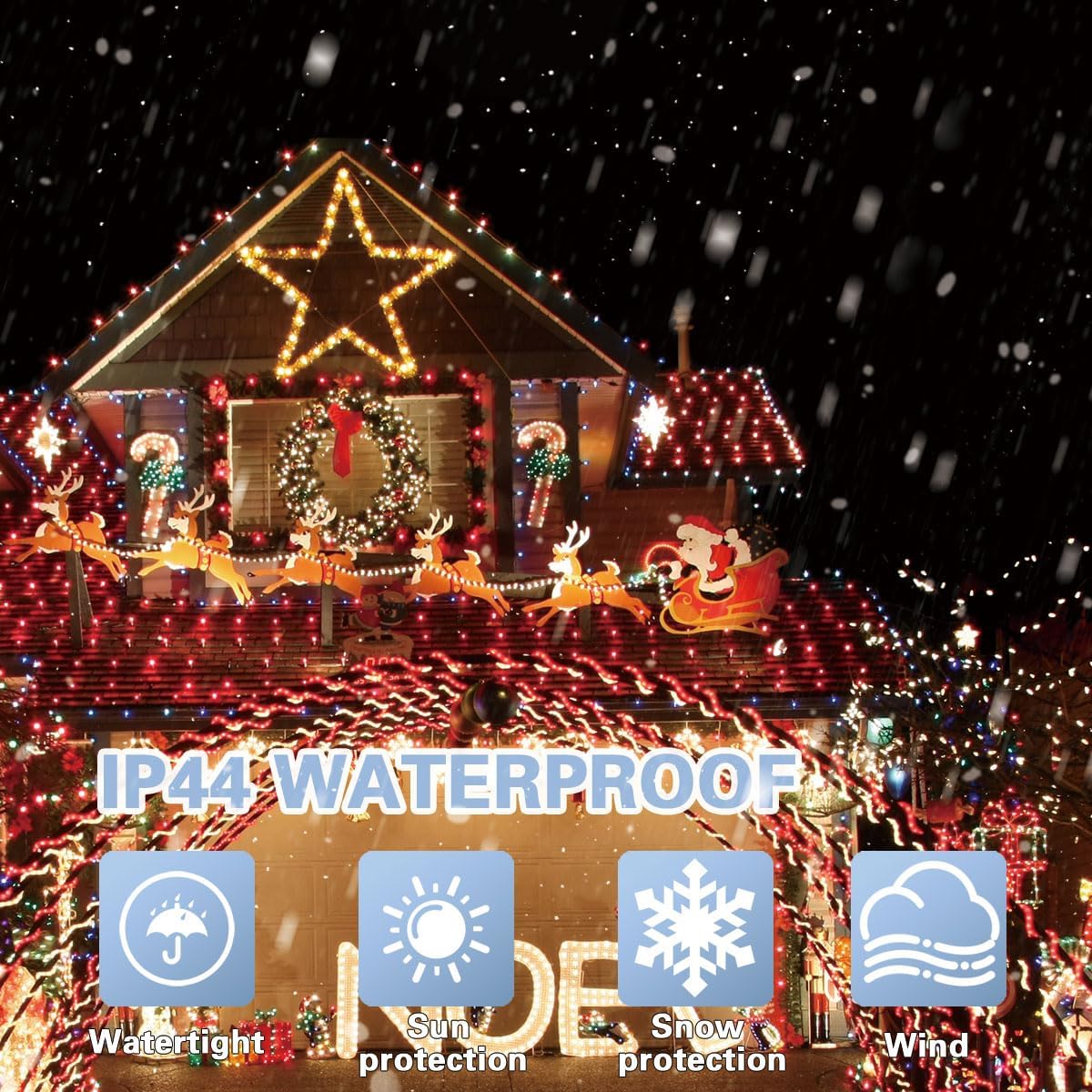 - Waterproof Outdoor String Lights: Our 200 LED waterproof string light has passed IP44 waterproof certification, it can resist water, perfect for indoor outdoor decorations, don't worry about using it in heavy rain and heavy snow, but warm tips please protect the plug.