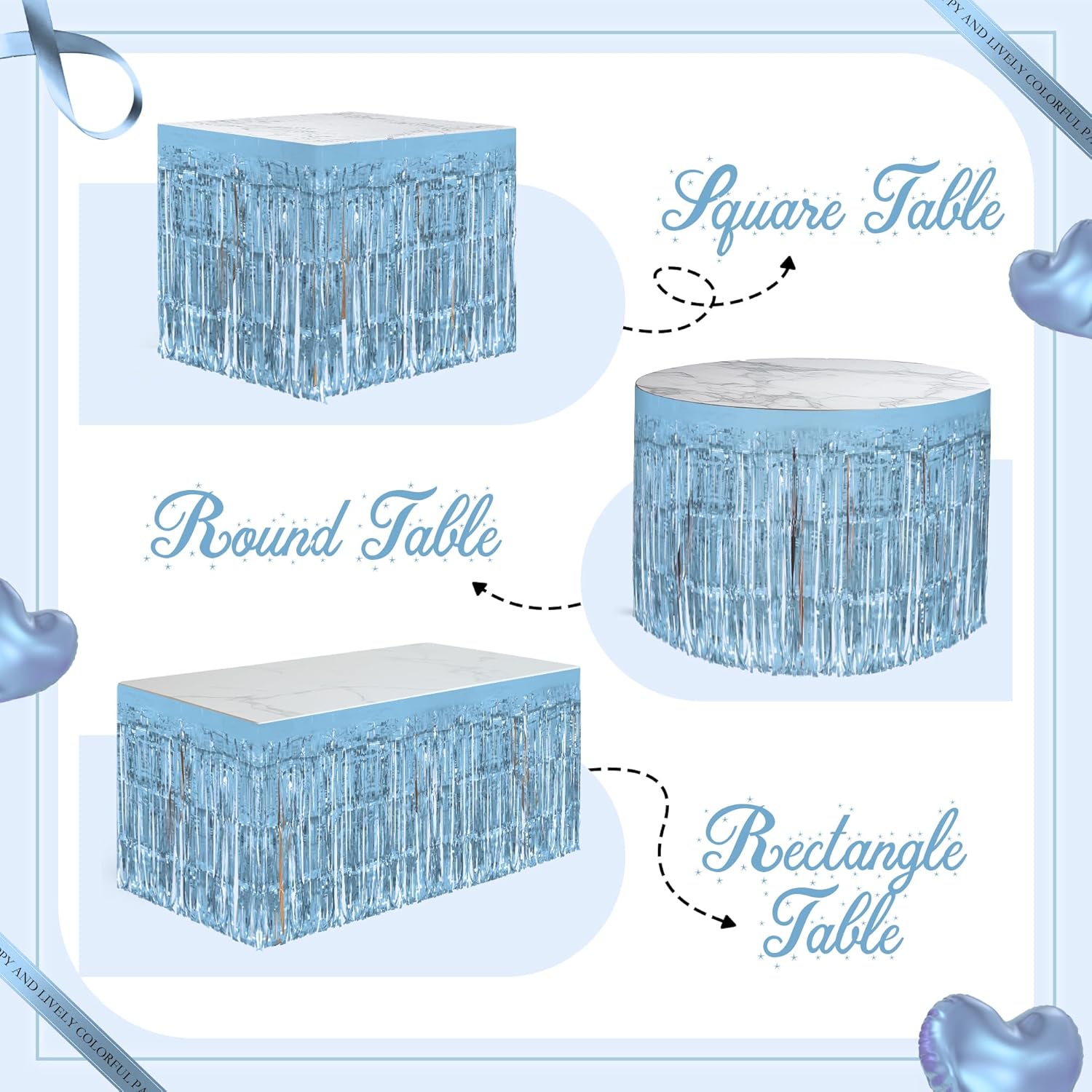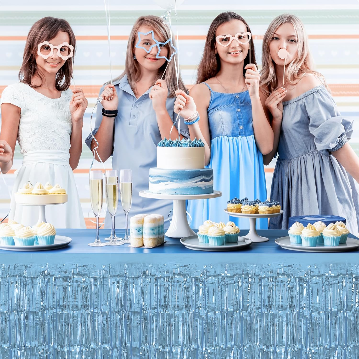 4 Pack Light Blue Table Skirts, 29x108" Metallic Foil Tinsel Fringe Table Skirts for Rectangle Tables Streamer Curtains Backdrop, Party Decorations for Birthdays Weddings Holidays