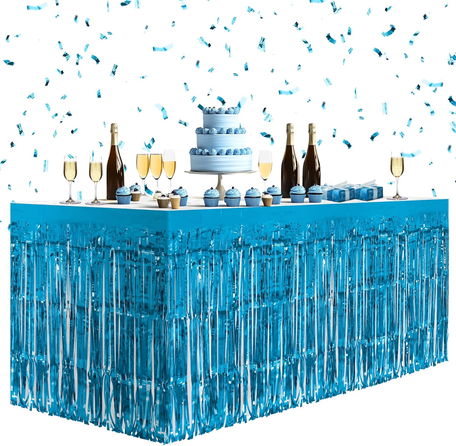 2 Pack Lake Blue Table Skirts, 29x108" Metallic Foil Tinsel Fringe Table Skirts for Rectangle Tables Streamer Curtains Backdrop, Party Decorations for Birthdays Weddings Holidays