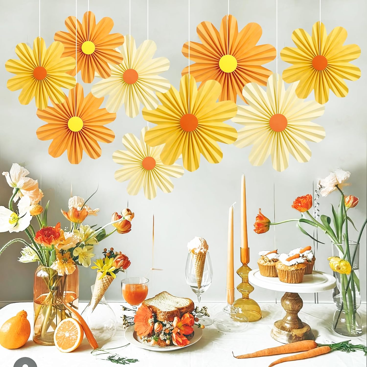 SUNBEAUTY 9 PCS Orange Paper Flowers Decorations for Wall Paper Fans Daisy Decoration Paper Floral Backdrop Decor Paper Fans Decoration