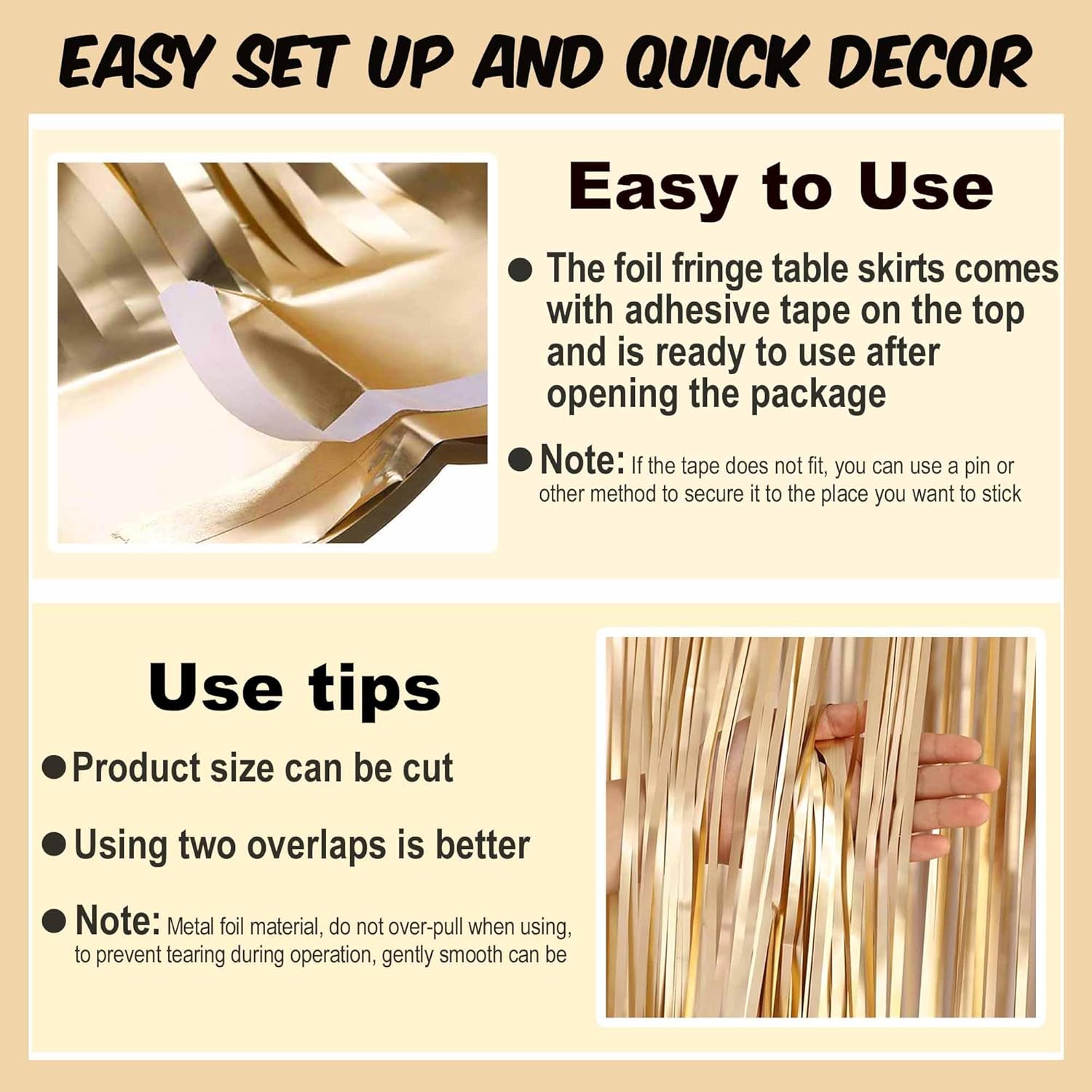 - Easy to Use: Each metallic fringe table skirts comes with self-adhesive tape on the top for easy attachment to your wall or table, just peel off the tape and then stick, easy and fast to install.
