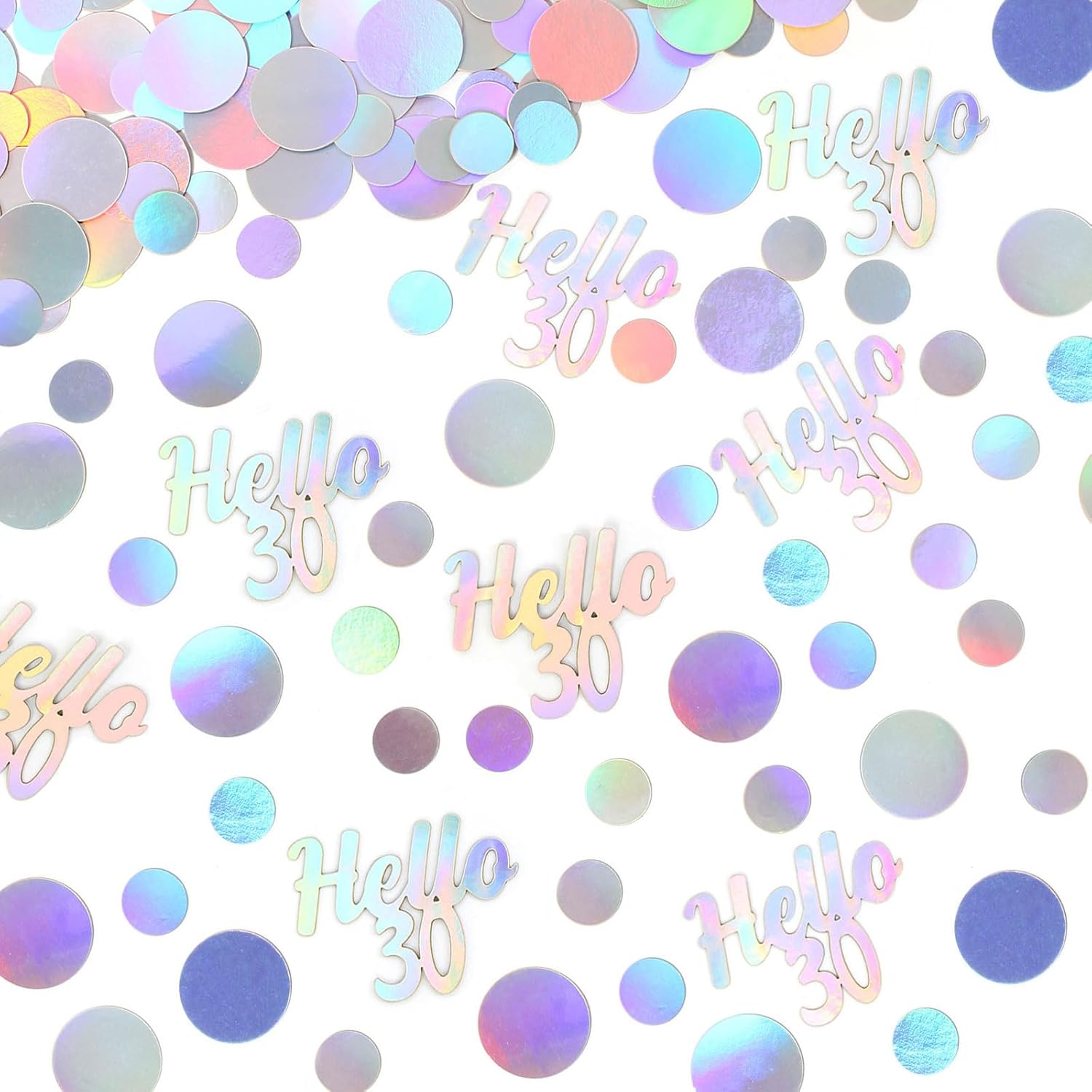 - Premium material, proper size and charming color.The cute biodegradable paper confetti is made from double sided silver foil paper card and well cut,the color is super amazing,looks like silver,but also like lots of pastel colors changing under the light. There is two sizes circles mix(1inch and 0.6inch),”Hello 30” letter confetti(1.7*1.3inch) ,recommend as table decorations or diy craft supply.