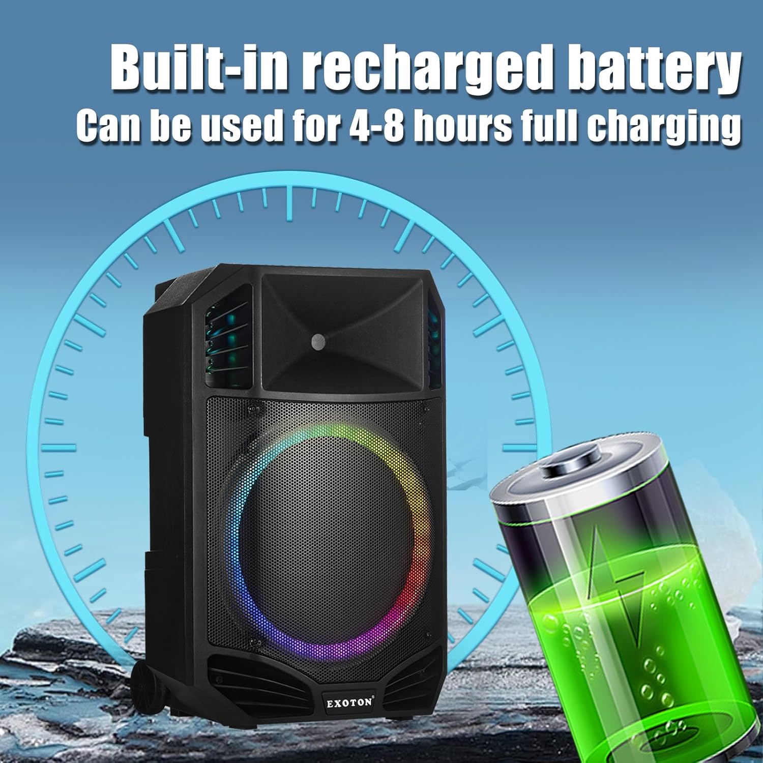 EXOTON S-1501 15 Inch Portable Rechargeable PA Speaker - 1600W, Bluetooth, TWS, USB/RCA, 2 UHF Mics, Remote, 7-Color Lights, DSP with 4 Scene Presets, 5-Band EQ