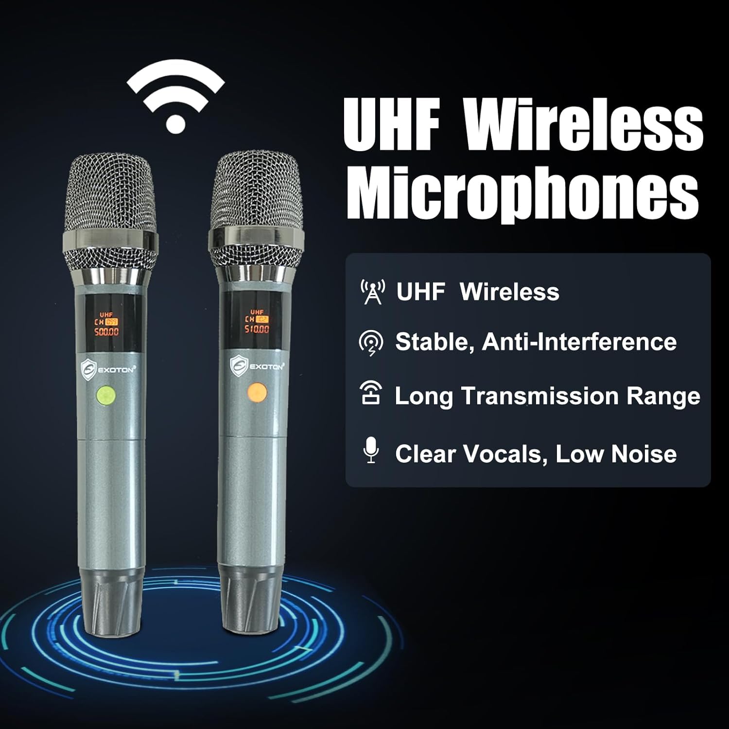 - 【UHF Microphone Inputs】The speaker system includes 2 UHF microphone inputs, allowing connection of two microphones for karaoke or live performances. The microphones are equipped with echo and noise reduction technology, providing clear and professional sound quality.
