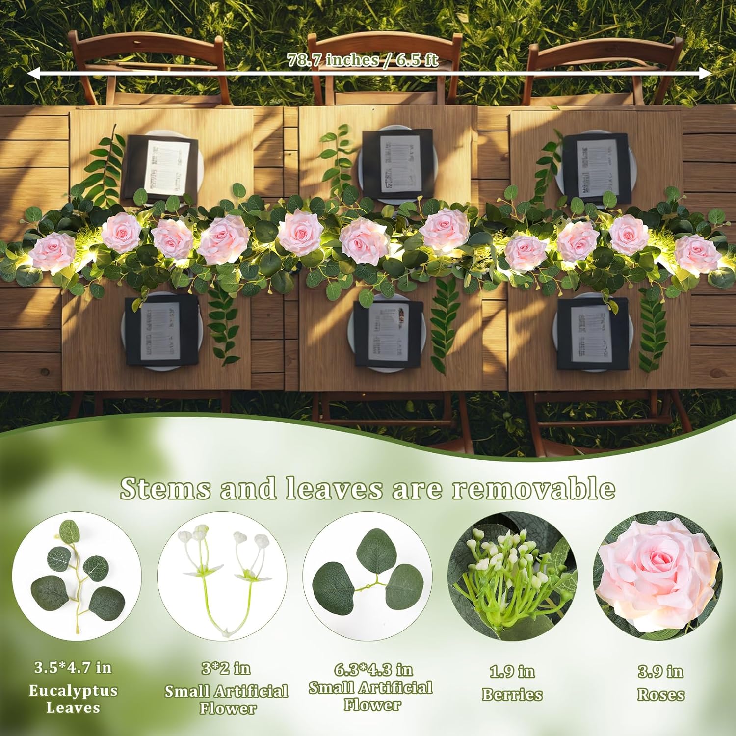 - Eucalyptus Garland with Built-in LED Lights: Transform any space into a magical setting with our 6.6FT eucalyptus garland, now upgraded with built-in led lights! Whether decorating a wedding arch, table centerpiece, fireplace mantel, backdrop, or outdoor garden fence, this rose flower garland brings timeless elegance and a touch of romance to any occasion. The versatile design allows for endless creative possibilities, making it perfect for weddings, Valentines Day, Mothers Day or seasonal celebrations
