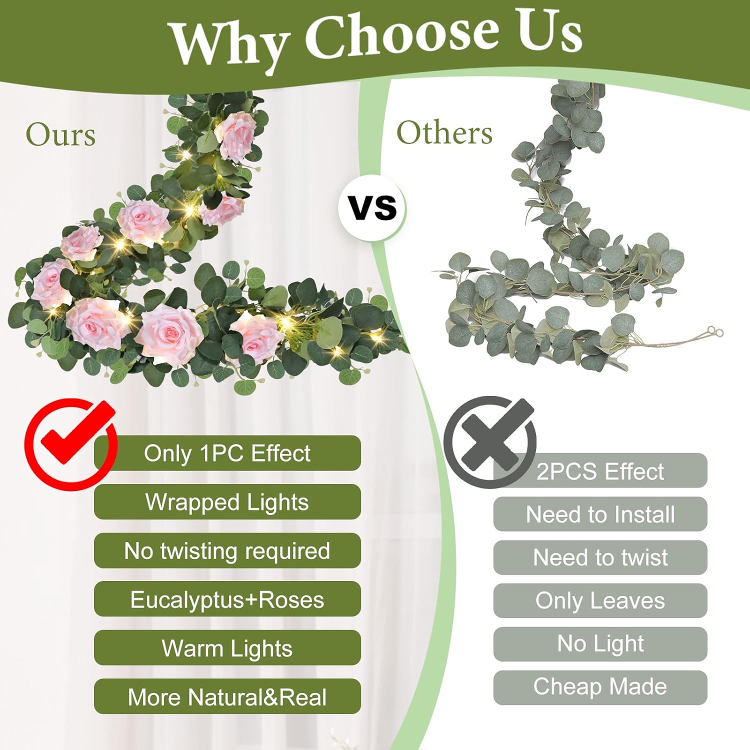 - Eucalyptus Garland with Built-in LED Lights: Transform any space into a magical setting with our 6.6FT eucalyptus garland, now upgraded with built-in led lights! Whether decorating a wedding arch, table centerpiece, fireplace mantel, backdrop, or outdoor garden fence, this rose flower garland brings timeless elegance and a touch of romance to any occasion. The versatile design allows for endless creative possibilities, making it perfect for weddings, Valentines Day, Mothers Day or seasonal celebrations