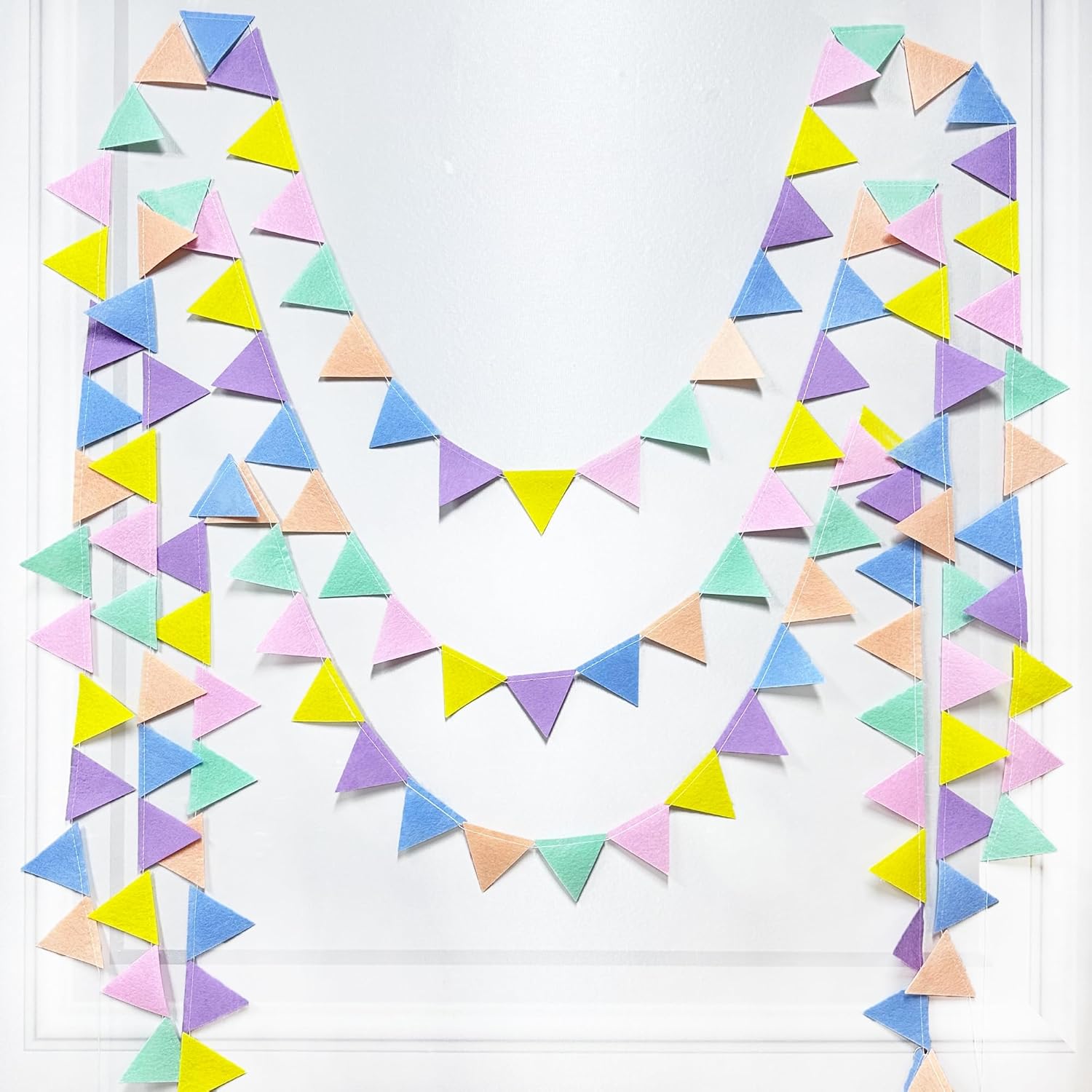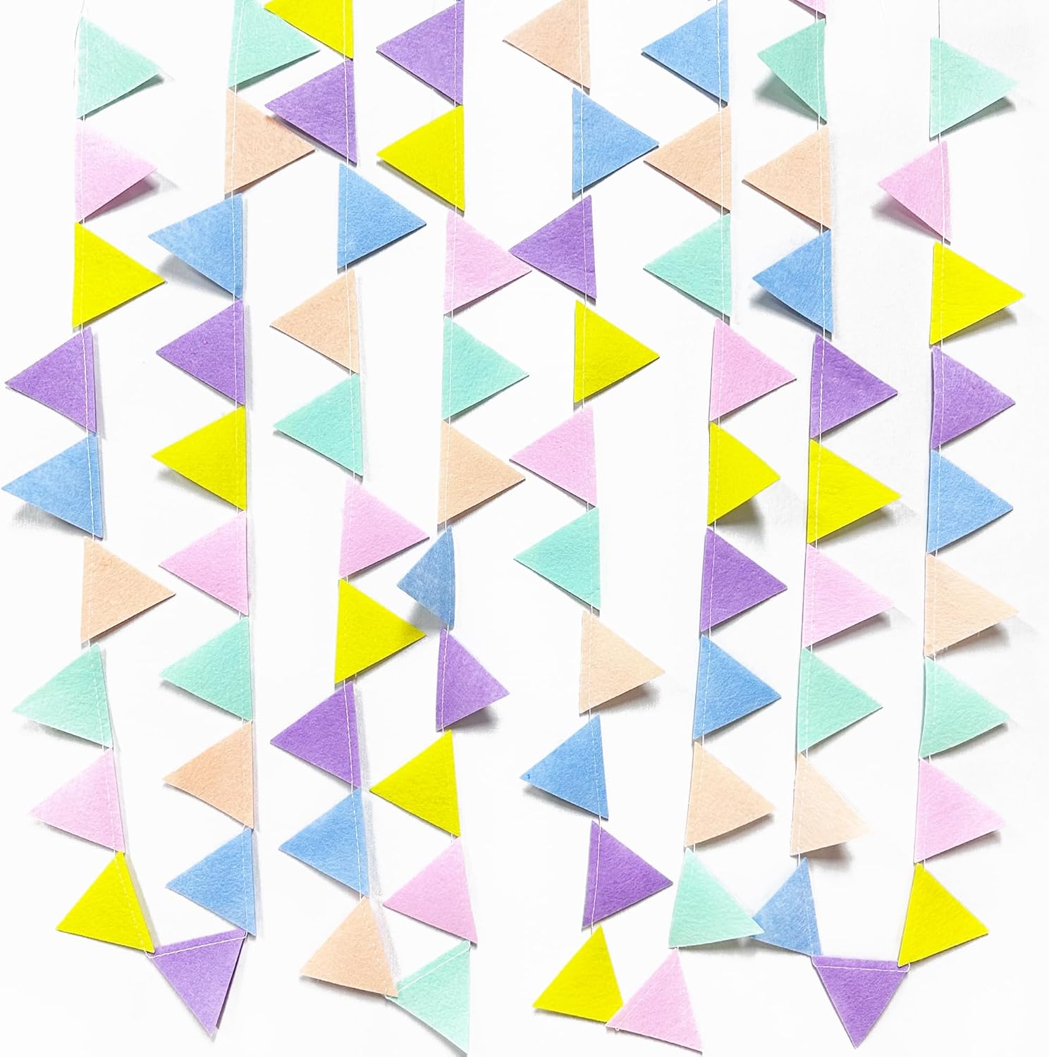 - Easy Assembly - Easy hanging and reusable.Perfect fit for pastel party decor.unroll and unwrap garland carefully. due to delicate nature of thread,may tangle.This pastel mini triangle pennant makes an attractive backdrop for videos and photos.