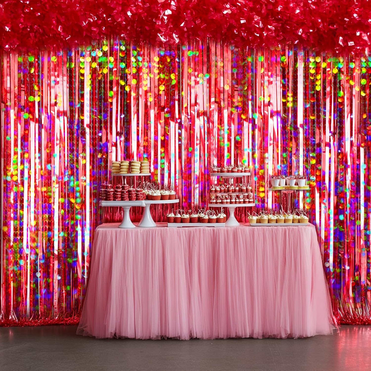 - Shiny Holographic Design: Different from usual red backdrop, our fringe backdrop features a shiny holographic design, and it shows different color effects under different light, reflecting light in shades of silver, blue, pink, purple, and teal, that creates an eye-catching and mesmerizing effect. Perfect for the doorway, window, wall, living room, dessert table backdrop, and stage background decorations.