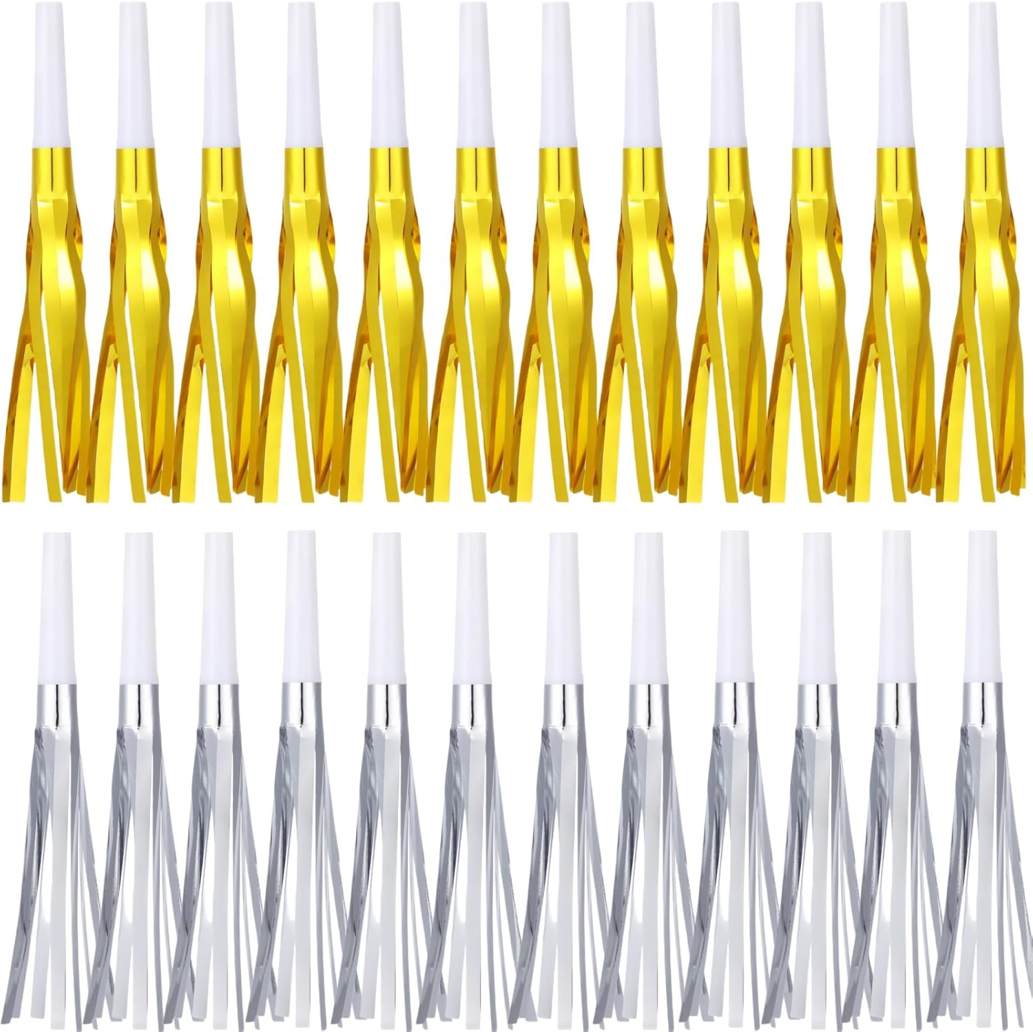 - Fun Party Favors: Set of 24 metallic fringed noise makers in gold white and silver white colors, perfect for celebrations like New Year's Eve, birthdays, and baby showers.